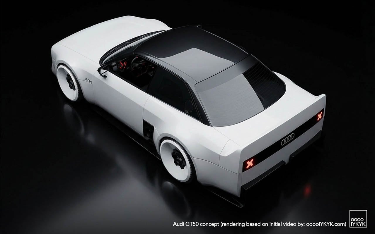 Le GT50 s’inspire principalement de la seconde lignée. Ses proportions empruntent directement aux voitures IMSA : la manière dont les ailes s’élargissent plutôt que de curver, la posture créée par les roues poussées aux coins de la carrosserie et l’aileron s’étendant sur toute la largeur du hayon. Les Quattro de rallye avaient un aspect différent. Le concept reconnaît cette distinction à travers des choix formels spécifiques plutôt que par un style « héritage » générique.