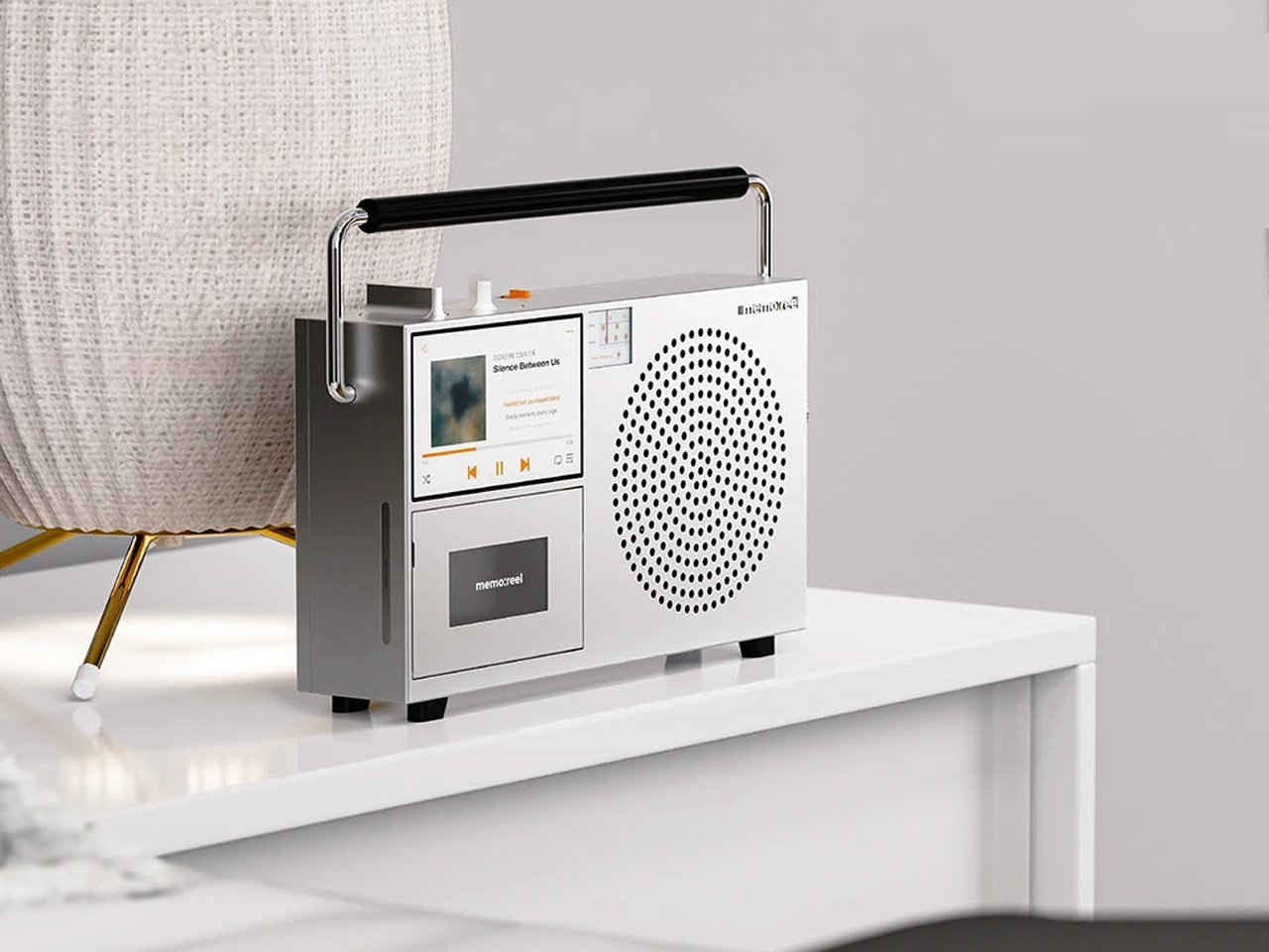 Le haut-parleur du memoreel ressemble à un lecteur de cassette traditionnel, avec des boutons tactiles pour le volume et le changement de piste. Il génère et rejoue les créations musicales basées sur les émotions enregistrées.