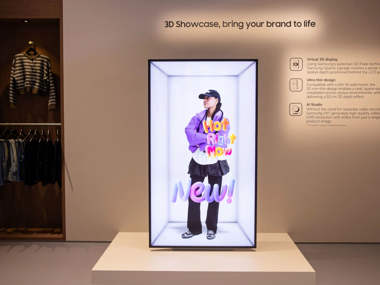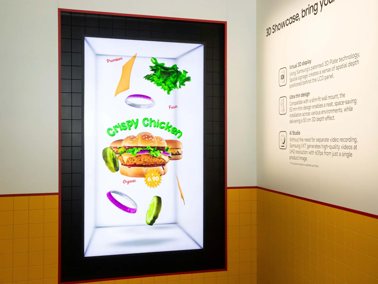 Samsung’s Spatial Signage est un affichage de 85 pouces en portrait qui utilise une plaque 3D brevetée pour créer un effet de profondeur sans lunettes ni casques. Il se monte sur un mur, donnant une illusion de produits ou de scènes en réalité augmentée.