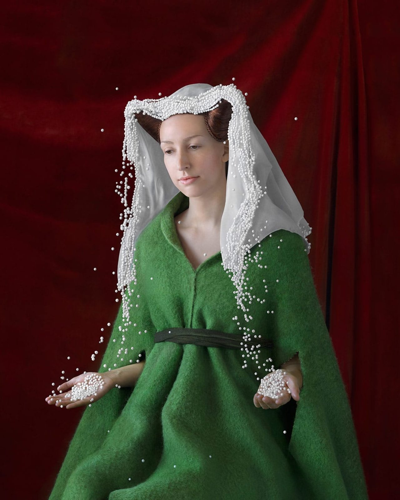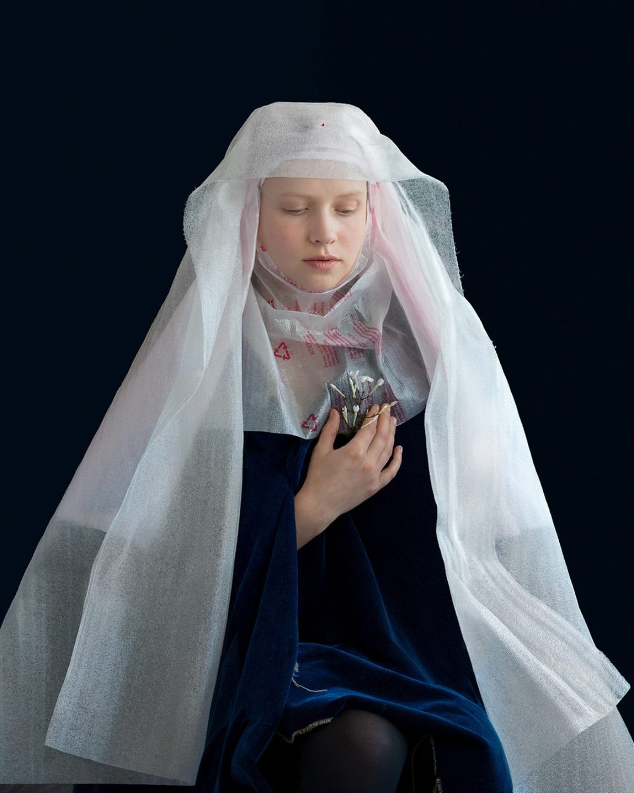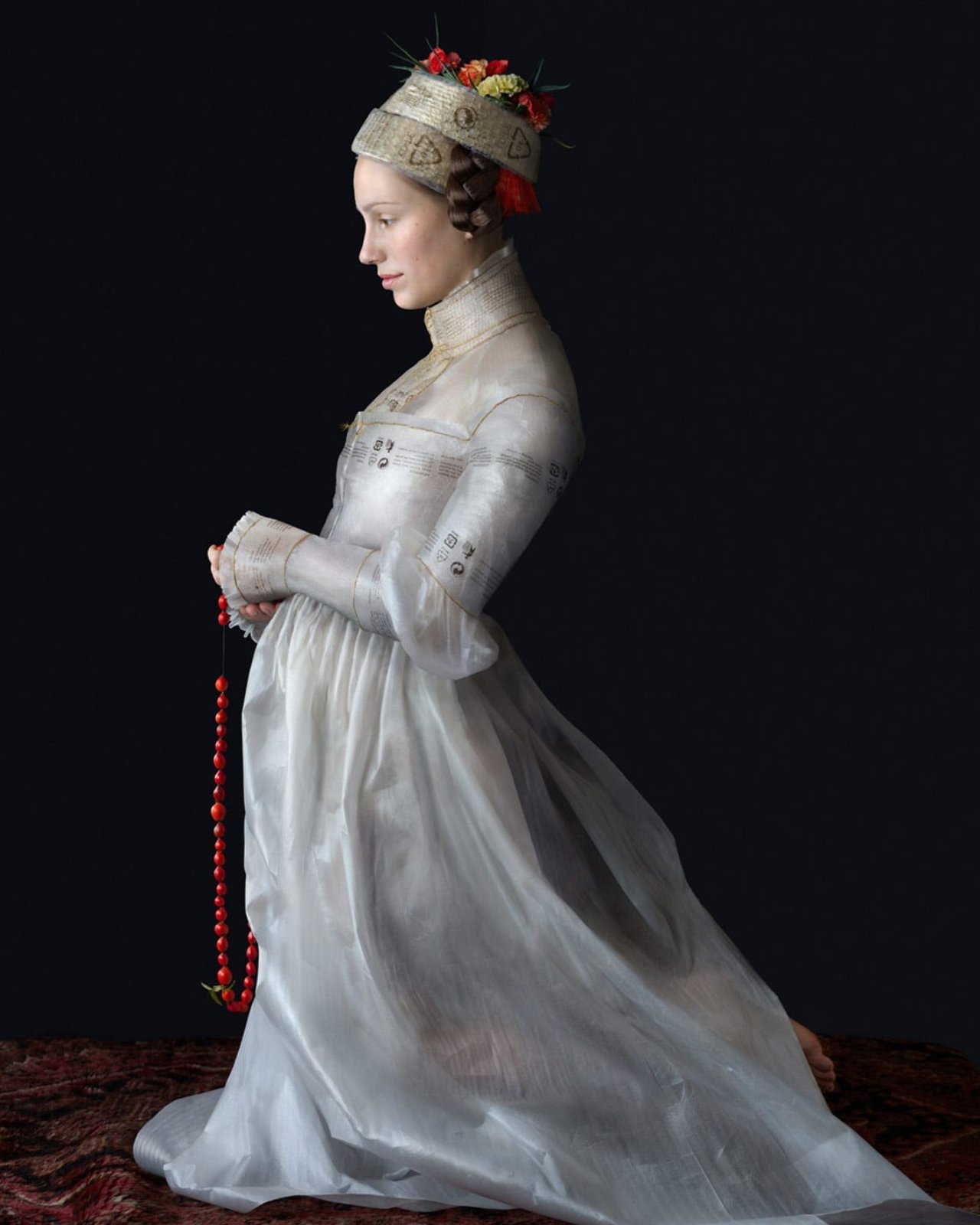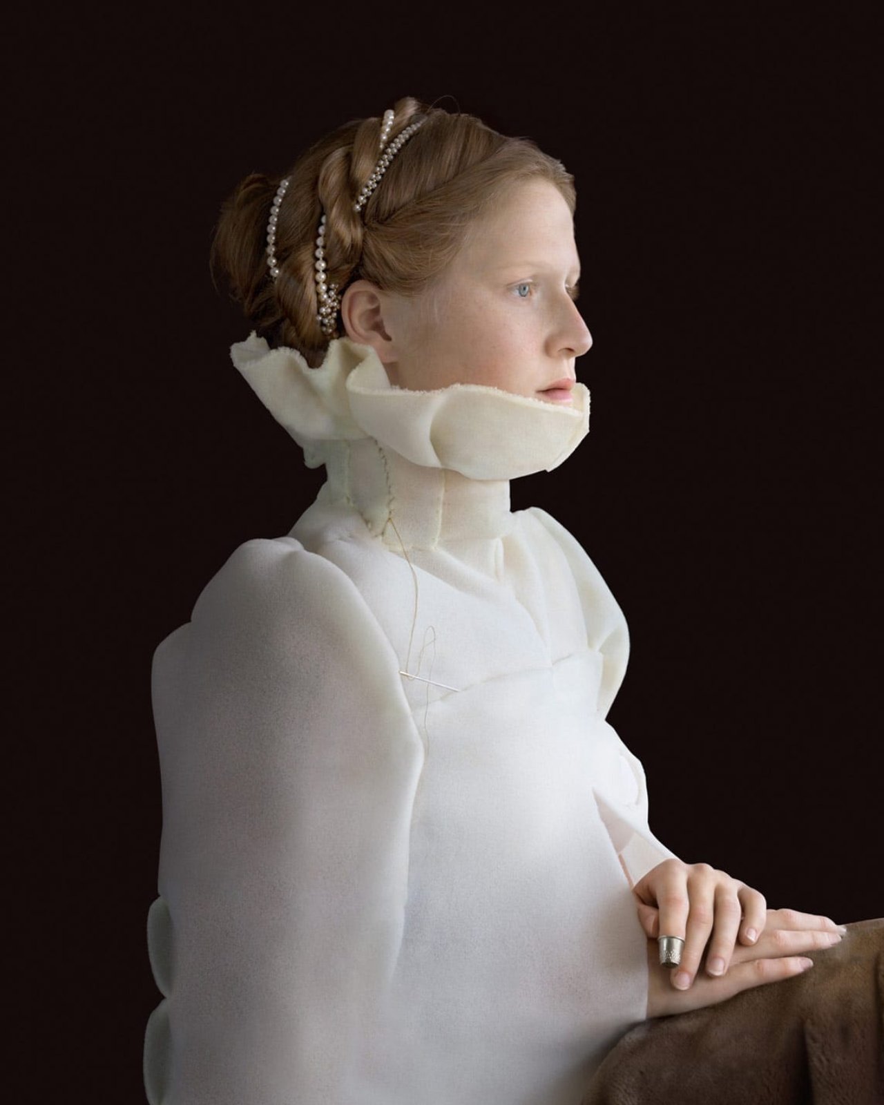 Le processus de création de Jongmans est hautement laborieux, impliquant des heures d’expérimentation et un travail manuel méticuleux. Chaque pièce est construite sur mesure pour s’adapter au modèle, avec une attention particulière portée à la texture, à la composition et à la silhouette. Les costumes finis sont ensuite immortalisés dans des photographies qui reflètent la qualité douce et picturale de la portraiture de la Renaissance. Ces images ont attiré l’attention internationale, permettant à Jongmans de participer à des expositions dans des galeries et des musées à travers l’Europe et au-delà.