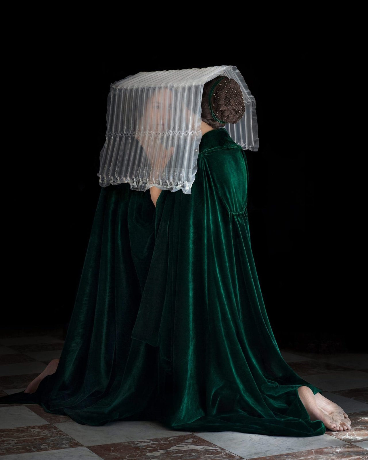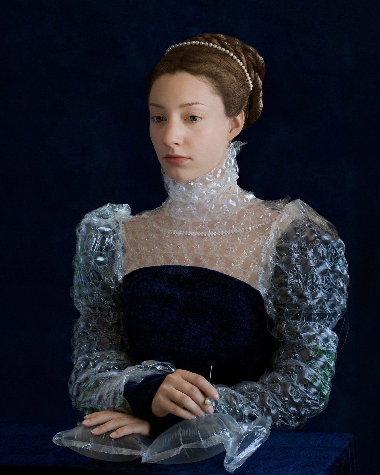 Lorsque l’on évoque la mode inspirée de la Renaissance, des images de riches velours, de dentelles complexes et de coiffures élaborées viennent souvent à l’esprit. Cependant, l’artiste et designer néerlandaise Suzanne Jongmans réinvente ces attentes de manière imaginative. Plutôt que d’utiliser des textiles traditionnels, Jongmans crée ses costumes historiquement inspirés à partir de matériaux recyclés tels que la mousse d’emballage, les feuilles de plastique et d’autres objets jetés. Son travail établit un pont entre le passé et le présent, prouvant que la beauté et la créativité peuvent émerger des sources les plus inattendues.