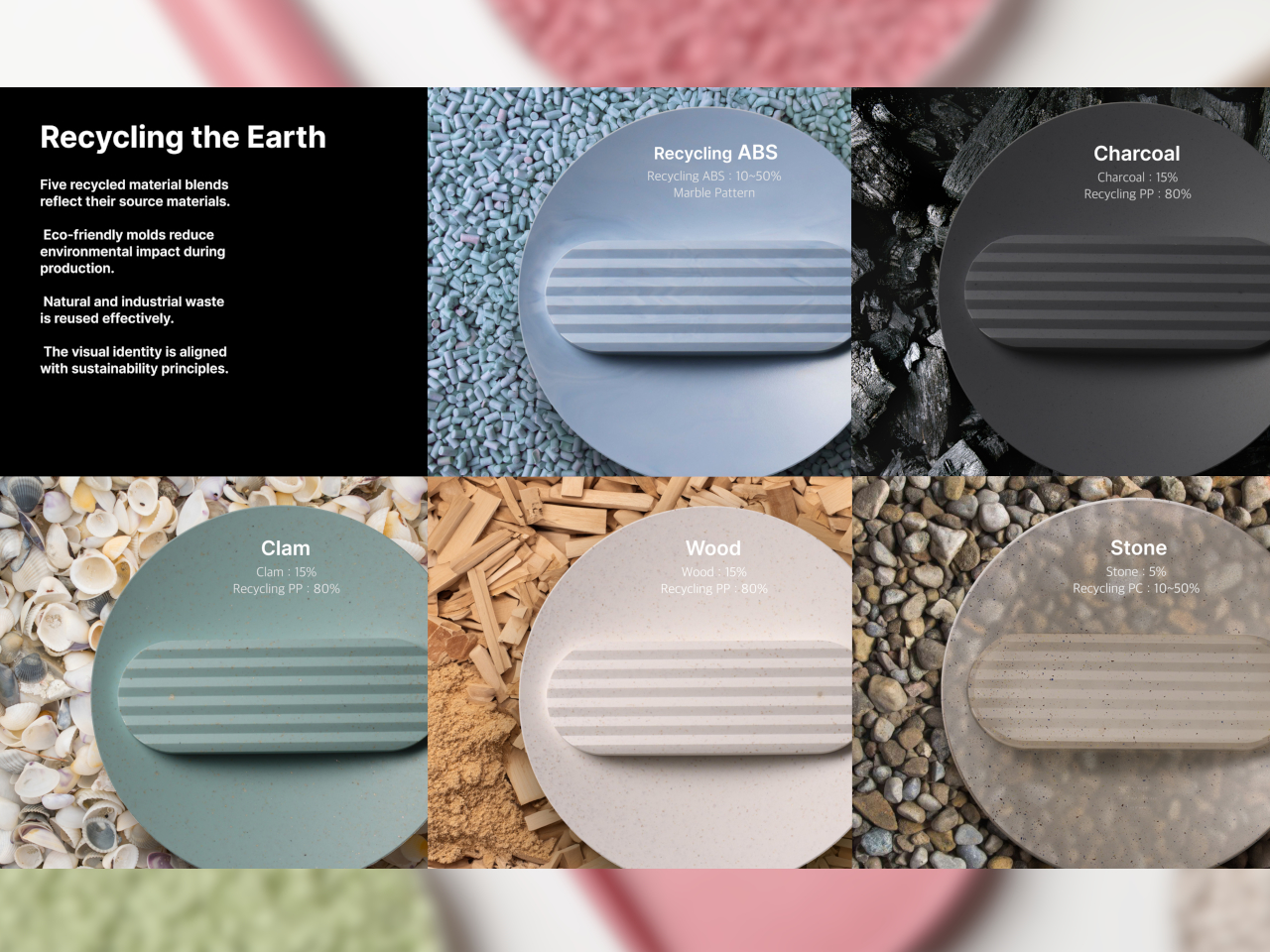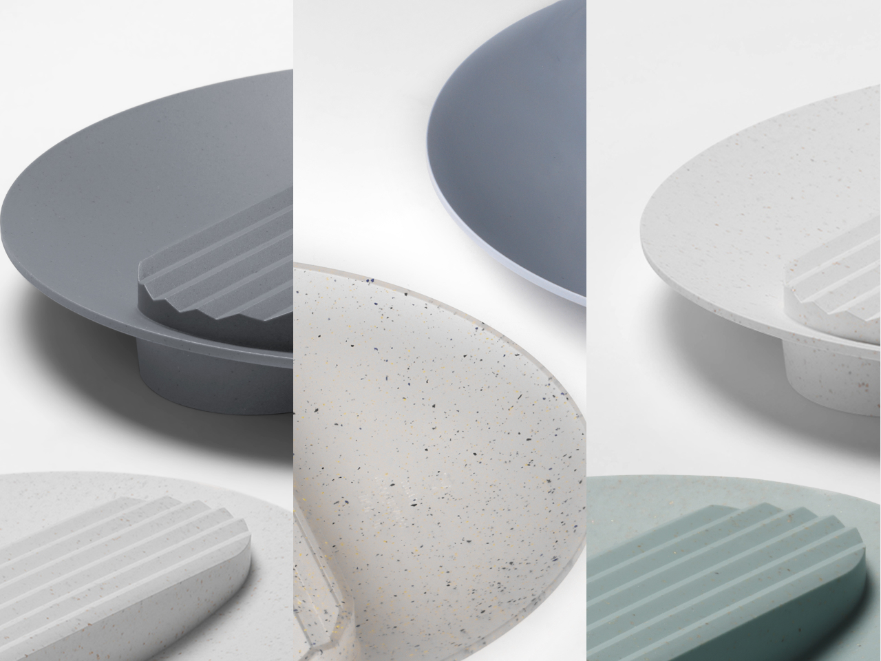 L’intention de créer un design qui corresponde au mode de vie promu par rmrp consiste à se distancer de l’impression que le plastique recyclé donne habituellement. Les versions Clam et Wood apparaissent comme des pastels doux et atténués, tandis que Charcoal offre une teinte grise architecturalement profonde. Les variantes Stone et Transparent jouent sur la translucidité et les textures. Plutôt que de cacher le contenu recyclé, le travail CMF utilise ce dernier comme une texture et un caractère, évoquant plus le terrazzo ou la faïence que les déchets injectés qui sont simplement gris.