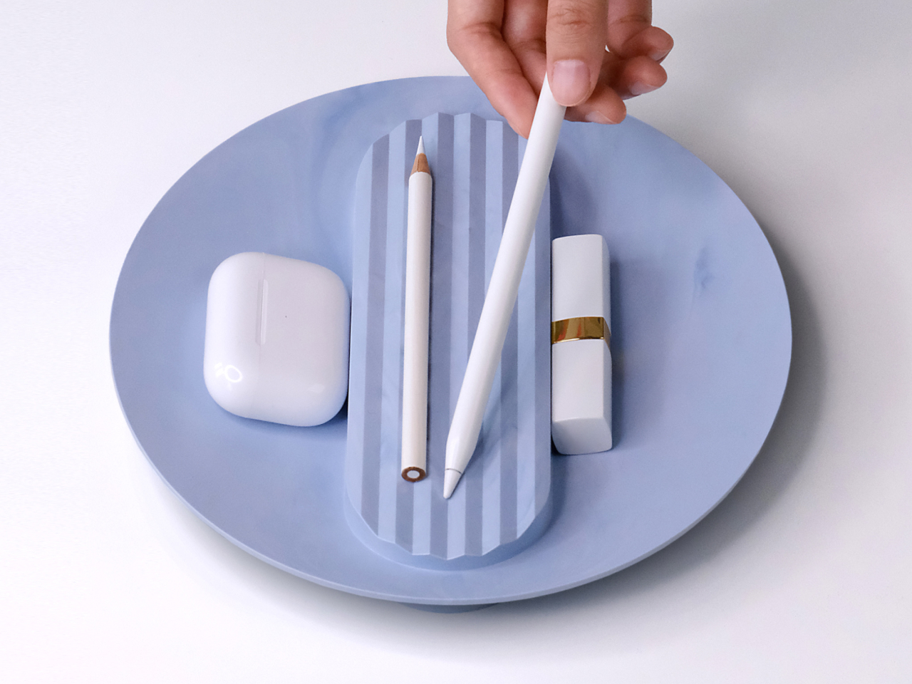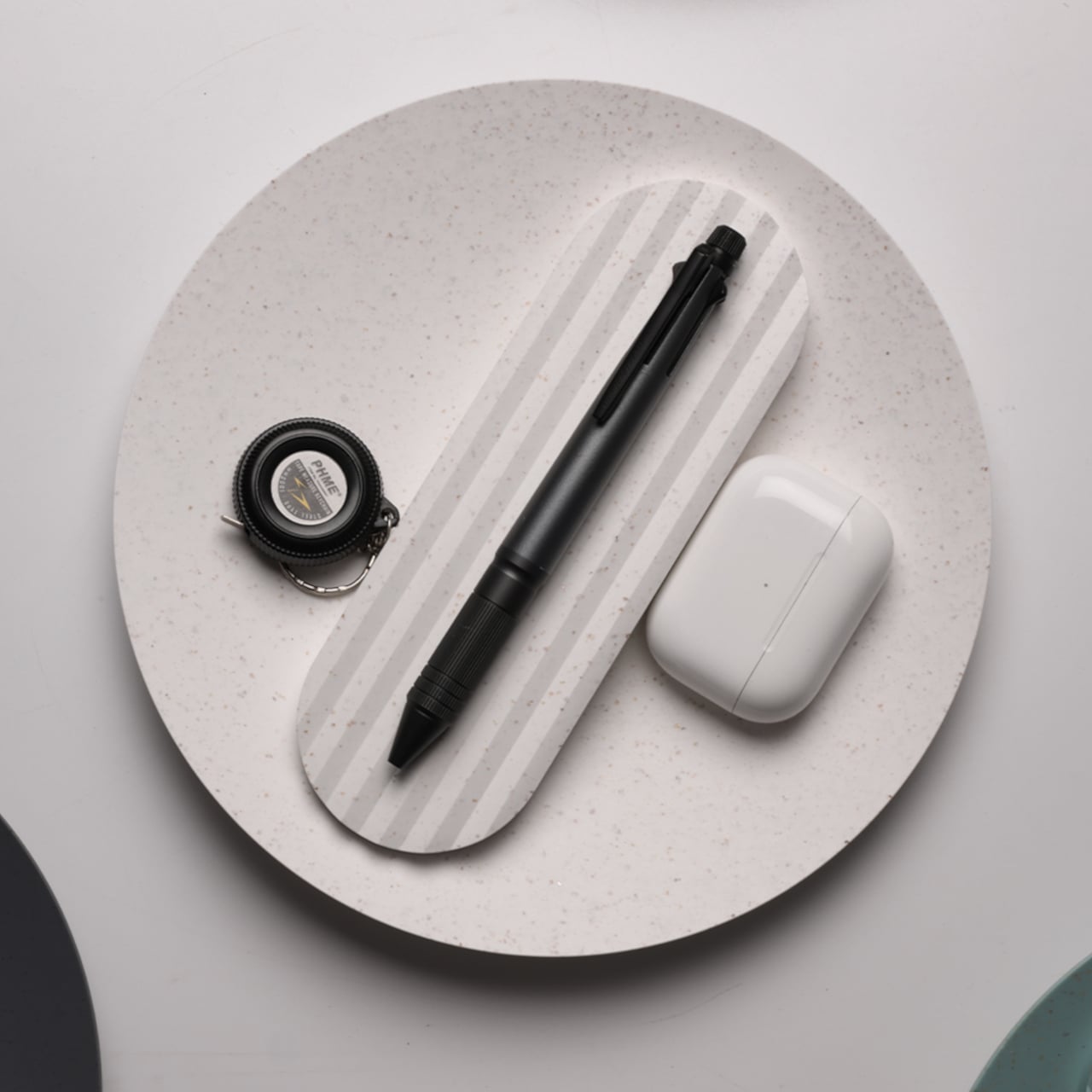 La forme du Tray210 recyclé est intuitive : un cercle de 210 mm avec une barre en relief qui traverse le centre et deux cuvettes peu profondes de chaque côté. La rainure centrale est conçue pour accueillir des stylos, des crayons ou des baguettes, tandis que les nervures empêchent les objets cylindriques de rouler. Les compartiments latéraux, ouverts et peu profonds, sont idéaux pour ranger des écouteurs, des attache-clips, des alliances ou des clés. C’est un agencement que l’on comprend d’un simple coup d’œil, sans besoin d’instructions.