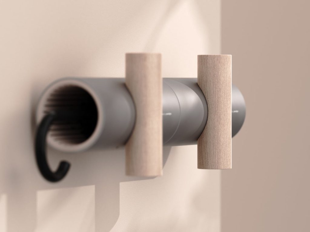 UMBRELLA+ redéfinit la notion de support pour parapluie en le déplaçant sur le mur. Il s’agit d’un cylindre horizontal qui accueille le parapluie plié, croisé par un élément vertical en bois servant de crochet pour sacs ou manteaux. Ce mouvement en forme de T place le parapluie à portée de vue, à la hauteur appropriée, combinant rangement et accroche en un système cohérent.