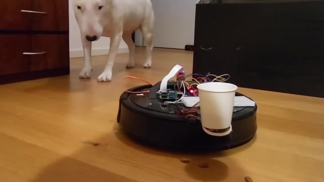 Le Roomba, en particulier, était destiné à nettoyer les sols dans une vie antérieure. Grâce à un matériel disponible dans le commerce, comme une carte Arduino, et à des compétences en électronique, il a été transformé en un distributeur de nourriture pour chiens. Ironiquement, au lieu de nettoyer, il participe désormais à la création de désordre, à moins que le dogue n’engloutisse les friandises avant qu’elles ne tombent au sol.
