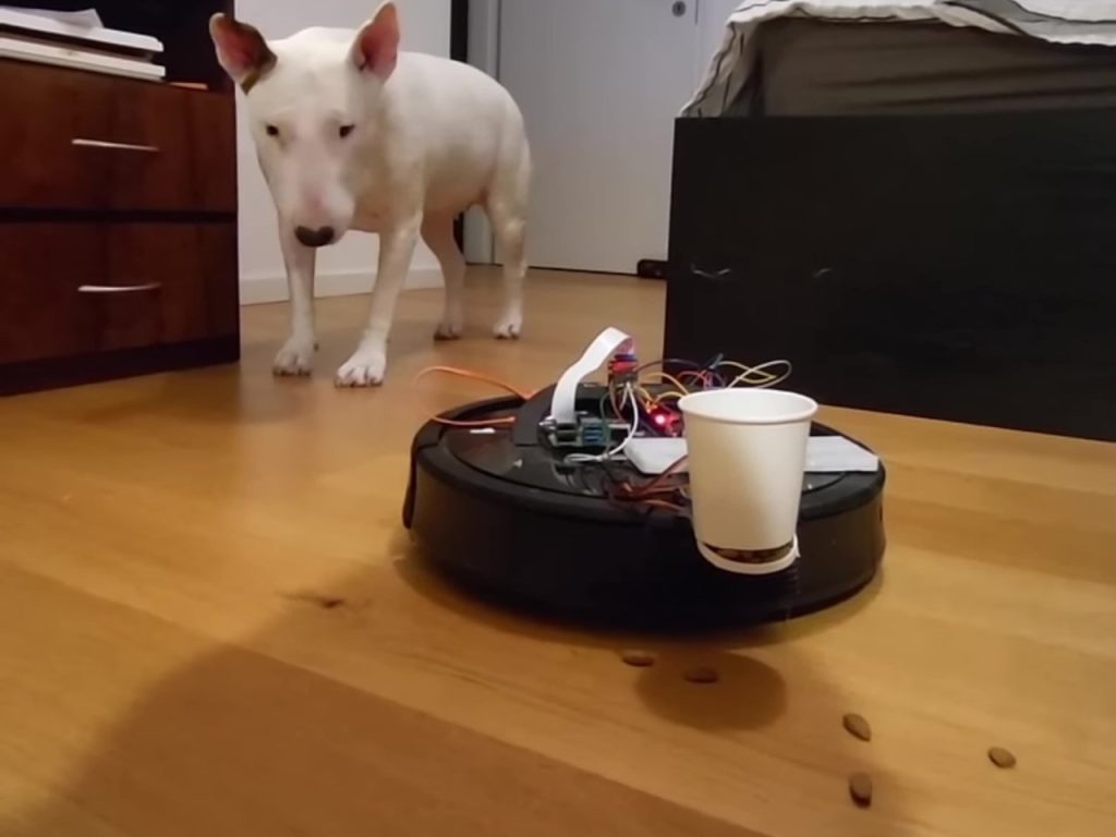 Le Roomba, en particulier, était destiné à nettoyer les sols dans une vie antérieure. Grâce à un matériel disponible dans le commerce, comme une carte Arduino, et à des compétences en électronique, il a été transformé en un distributeur de nourriture pour chiens. Ironiquement, au lieu de nettoyer, il participe désormais à la création de désordre, à moins que le dogue n’engloutisse les friandises avant qu’elles ne tombent au sol.