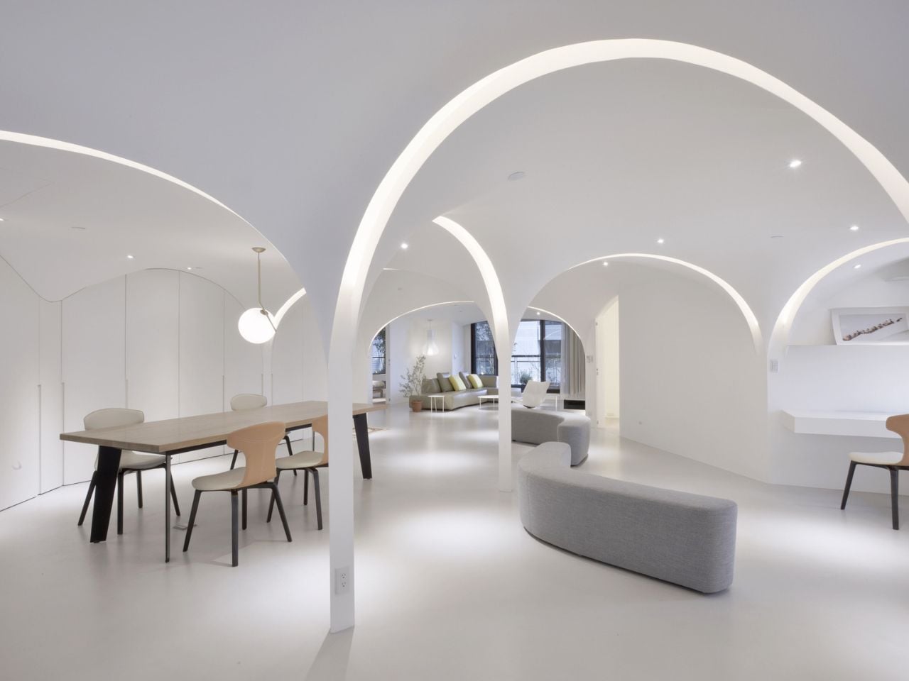 Les arches, les courbes et l’éclairage dissimulé autour des dômes apportent une atmosphère minimales et riche, où la lumière et le mouvement de l’air sont intégrés à la chorégraphie spatiale, créant un environnement délicat et intentionnel.