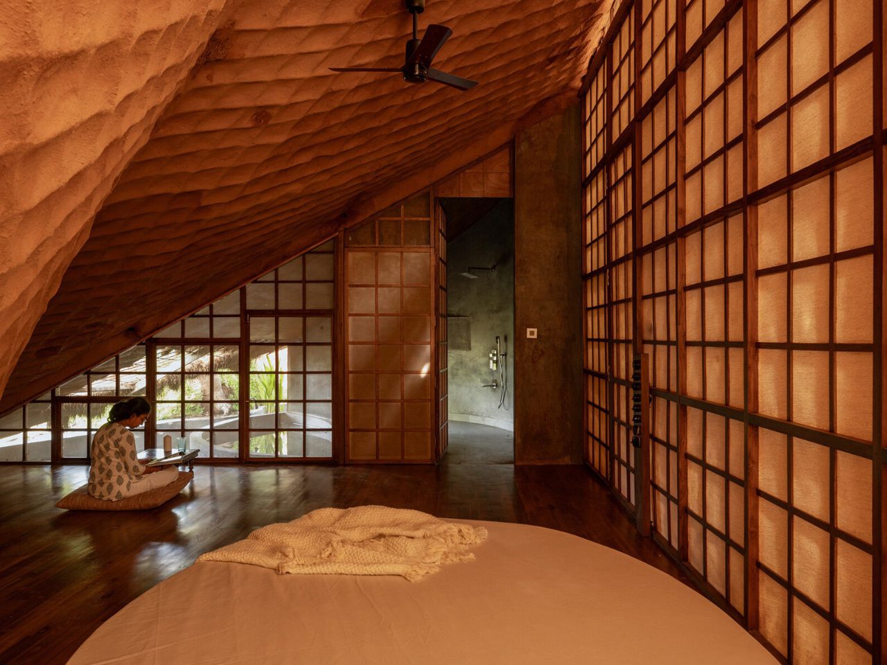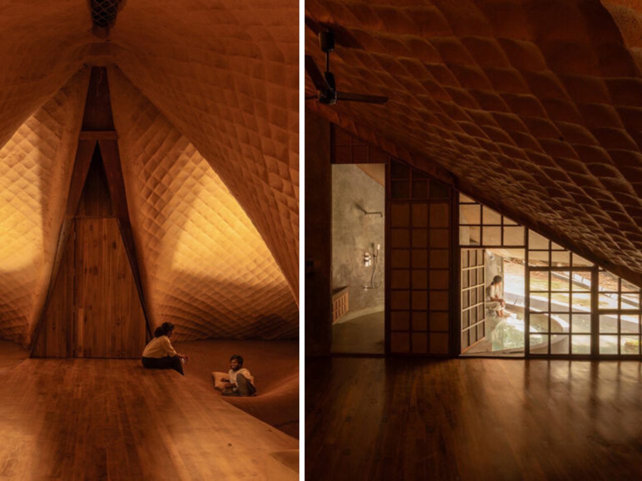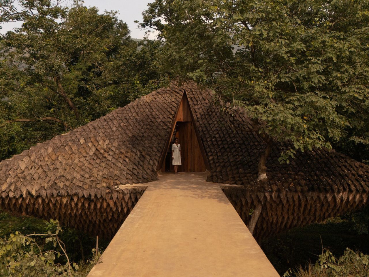 Fidèle à l’éthique du minimalisme contextuel de Wallmakers, la maison repose légèrement sur son site. La surface en chaume, empilée en écailles superposées rappelant la peau d’un pangolin, se fond parfaitement dans la canopée forestière. Au-delà des aspects esthétiques, ce revêtement assure une isolation thermique, garantissant des intérieurs frais même dans le climat humide de Karjat.
