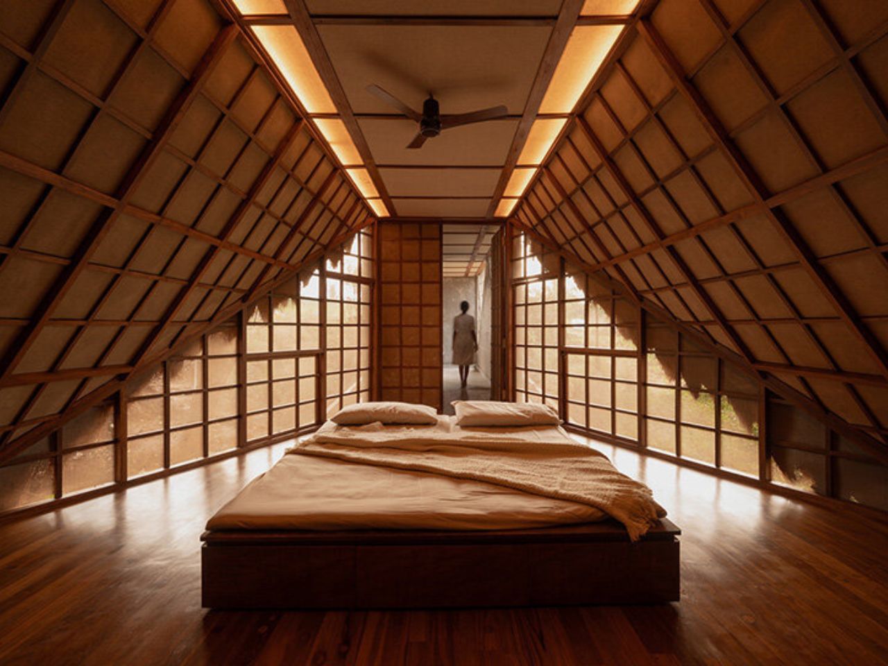 L’intérieur est minimaliste mais chaleureux, défini par du bois de pont récupéré, du jute et des écrans en maille tissée qui modulent la lumière et le flux d’air. Quatre chambres s’ouvrent à l’extérieur, certaines vers la cime des arbres, d’autres sur le ruisseau, créant un dialogue rythmique entre l’enfermement et l’exposition. Les transitions sont fluides : la frontière entre "intérieur" et "extérieur" se dissout dans une lumière tamisée et des ombres mouvantes.