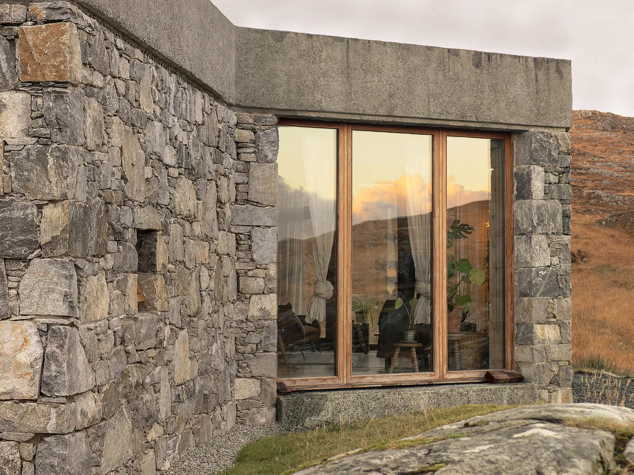 La forme sculpturale du bâtiment est revêtue du même gneiss léwisien sur lequel elle repose, extrait d’une carrière à moins de cinq milles. Ce rocher ancien, âgé de plusieurs milliards d’années, confère à la maison une qualité intemporelle, renforçant son lien avec le paysage environnant. Un parapet en béton, avec du gneiss exposé, couronne les murs, créant un contraste contemporain avec le matériau traditionnel. Le gneiss est utilisé en pleine épaisseur comme bardage extérieur, démontrant un engagement envers l’authenticité et la durabilité. De plus, les fenêtres en bois dur ajoutent une touche moderne tout en respectant les traditions vernaculaires de l’île.