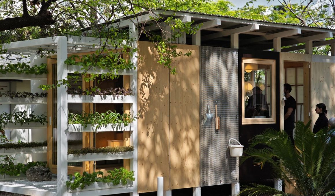 La maison se compose de modules qui servent différentes fonctions, tels qu’une salle de bain avec une baignoire en bois japonais, et un espace de travail-restaurant. Son design modulaire permet d’ajuster la taille et la disposition intérieure en fonction des besoins.