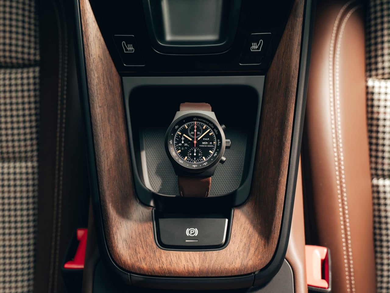 La montre est dotée d’un boîtier en titane noir de 40 à 41 millimètres, accompagné d’un bracelet en titane brossé et d’un système de changement rapide vers un bracelet en cuir Truffle Brown, rappelant l’intérieur du GT3 90 F. A. Porsche.