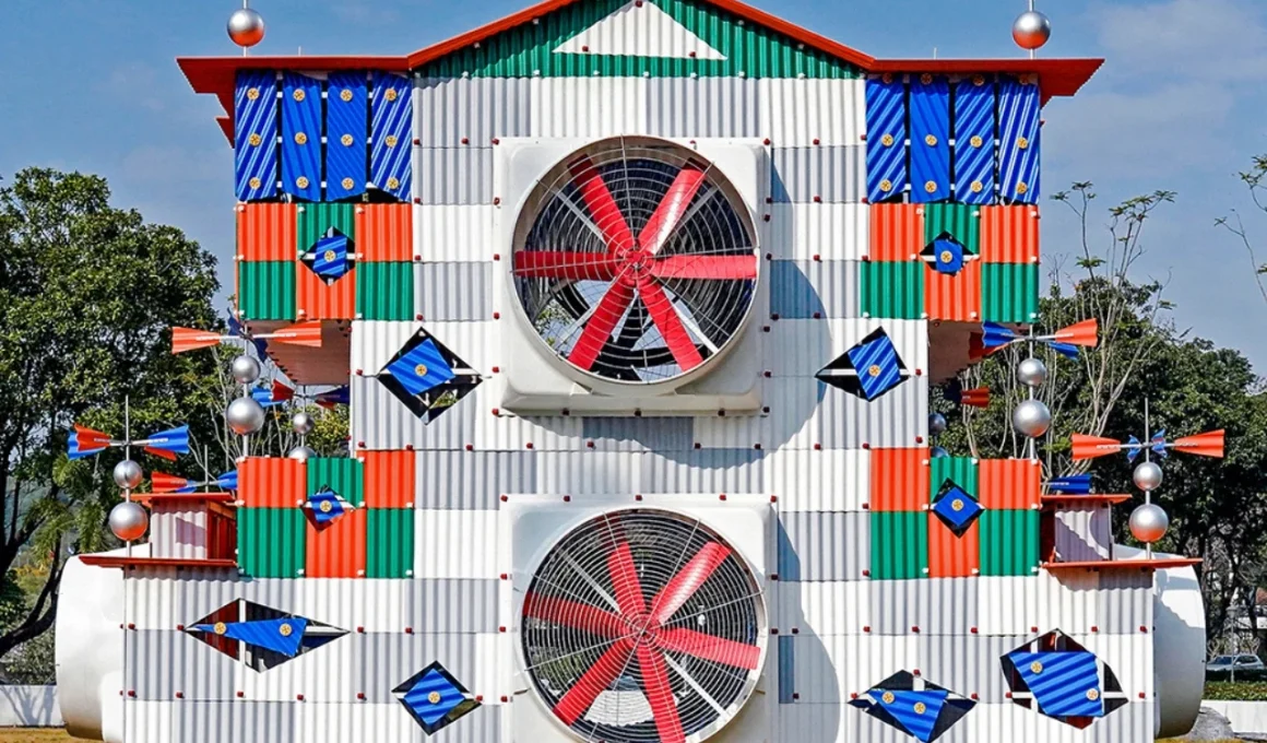 Clock House No. 2 revisite cet échange historique à travers un prisme contemporain. Au lieu d’utiliser des engrenages en laiton et des ressorts délicats, le studio a opté pour des composants industriels à faible coût. La structure évoque les façades superposées et les toits carrelés typiques des habitations quotidiennes de la province du Guangdong, mêlant l’architecture vernaculaire locale avec la logique ornementale des horloges automates historiques. Le résultat est à la fois familier et étranger.