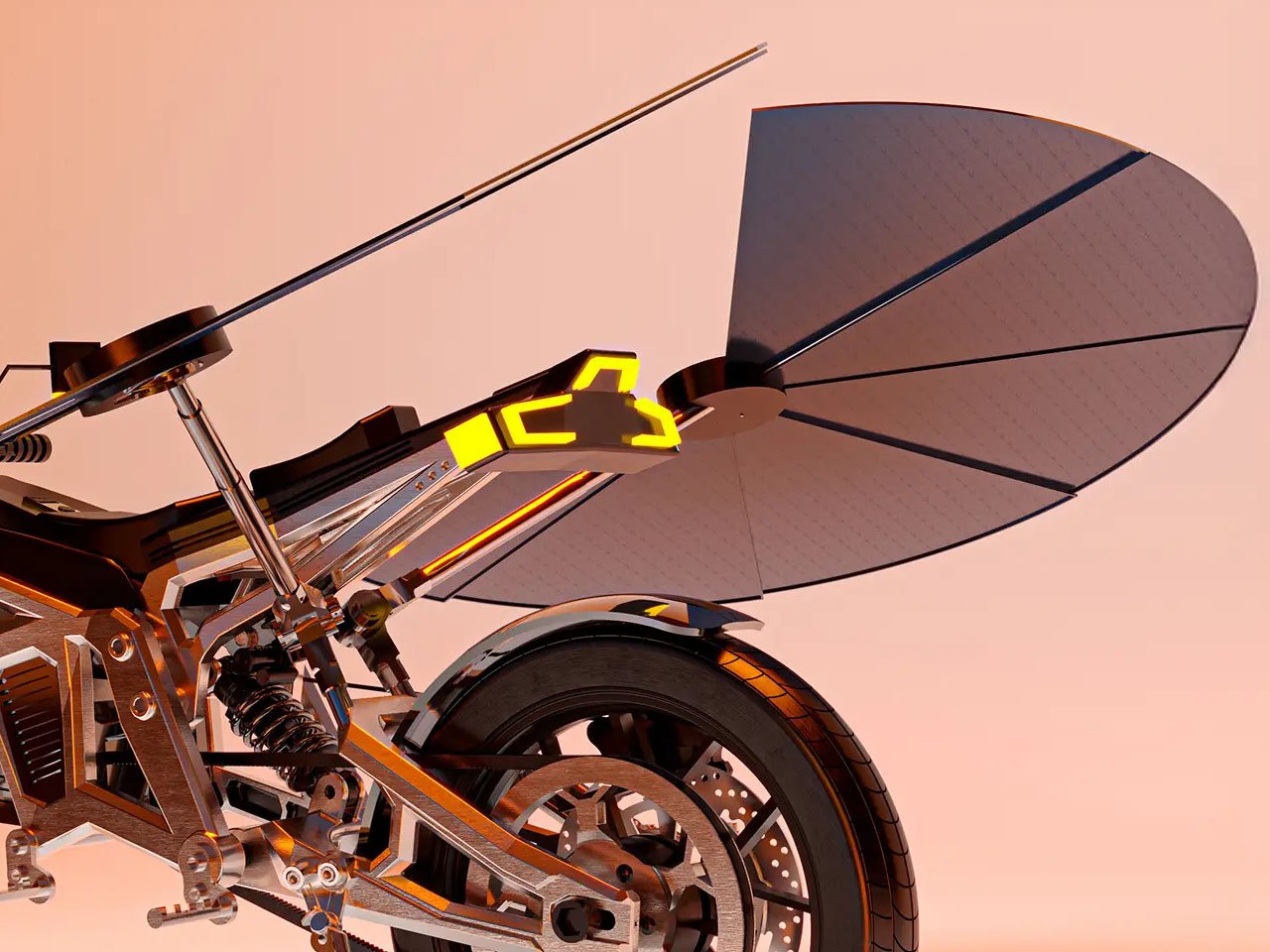 L’identité visuelle joue un rôle tout aussi crucial dans son attrait. L’aile déployable s’inspire de la structure de l’aile d’une libellule, fusionnant l’efficacité naturelle avec une esthétique mécanique. Cette approche biomimétique confère à la motocyclette une présence distinctive tout en renforçant sa connexion à l’environnement dont elle dépend pour obtenir son énergie. L’alliance d’influences organiques et de précision technique crée une forme qui communique à la fois le but et l’innovation, captivant l’attention des utilisateurs soucieux de durabilité et de design futuriste.