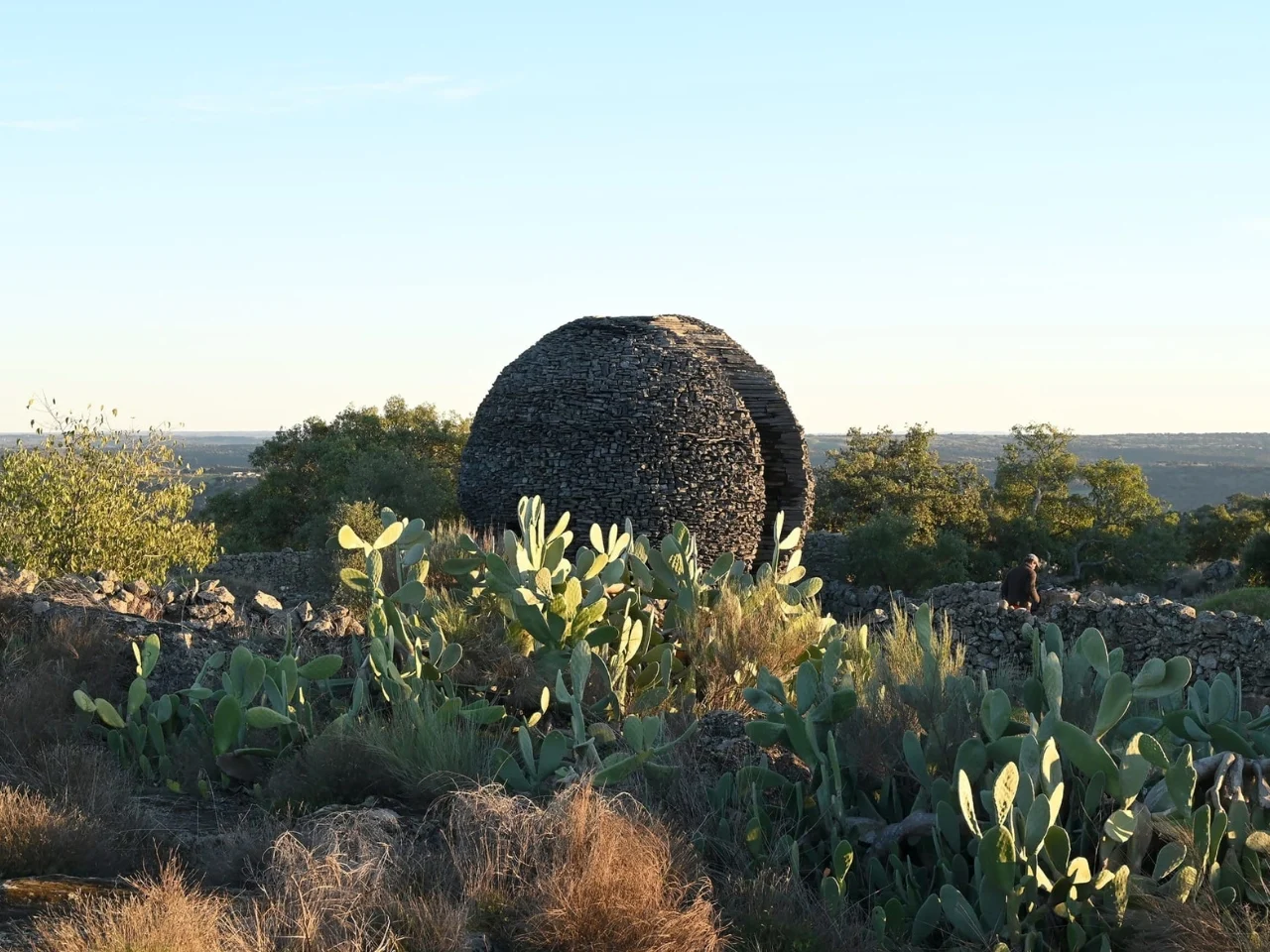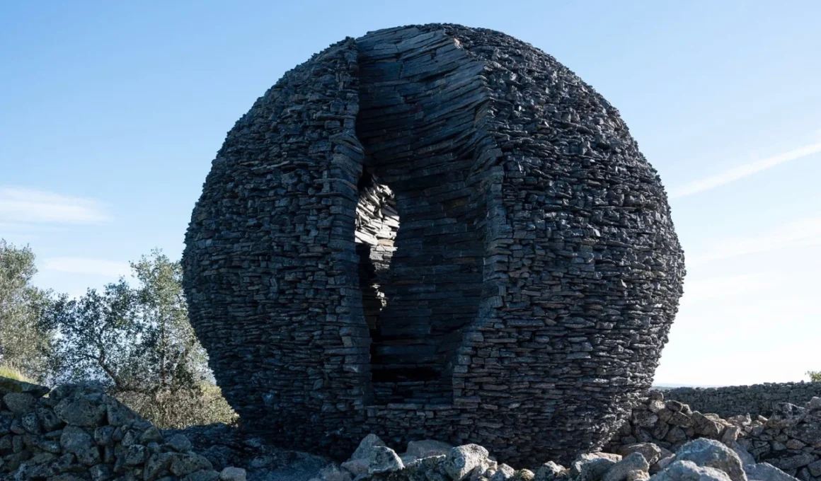 Imaginez-vous sur un plateau rocheux à Salvaterra do Extremo, un petit village frontalier où le Portugal rencontre l’Espagne. Le terrain, âpre et accidenté, est parsemé de vieux murs en pierres sèches et de végétation clairsemée. Au milieu de cet environnement se dresse cette sphère de cinq mètres, entièrement réalisée en schiste noir local, une pierre qui se caractérise par des couches plates et magnifiques. Sous le ciel, elle évoque soit un objet tombé du ciel, soit quelque chose qui a émergé de la terre — ou peut-être les deux.