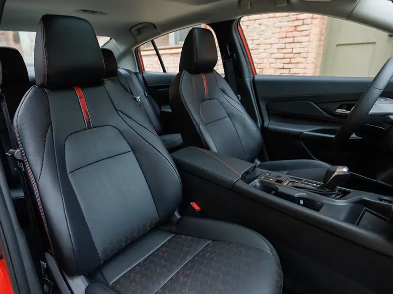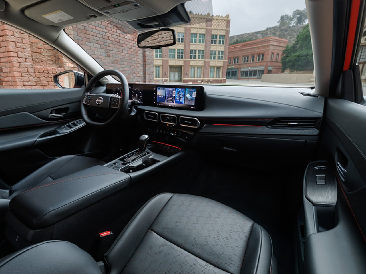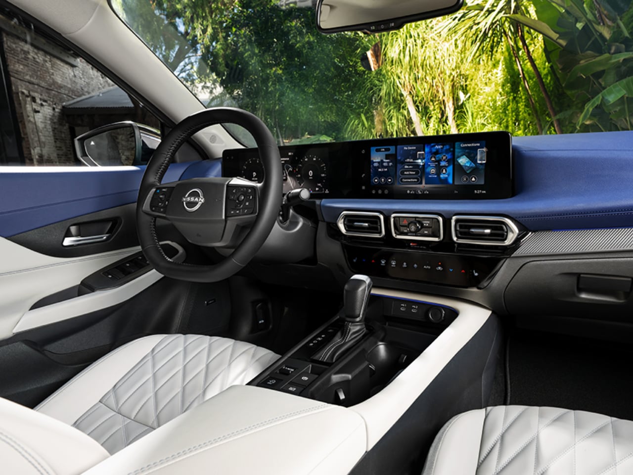 Trois éléments rectangulaires sur le tableau de bord accueillent les aérateurs, une référence délibérée aux trois aérateurs circulaires de la Sentra précédente, réinterprétés dans des lignes modernes. Les surfaces douces des portières rendent chaque interaction intentionnelle grâce à des choix de design tactile.