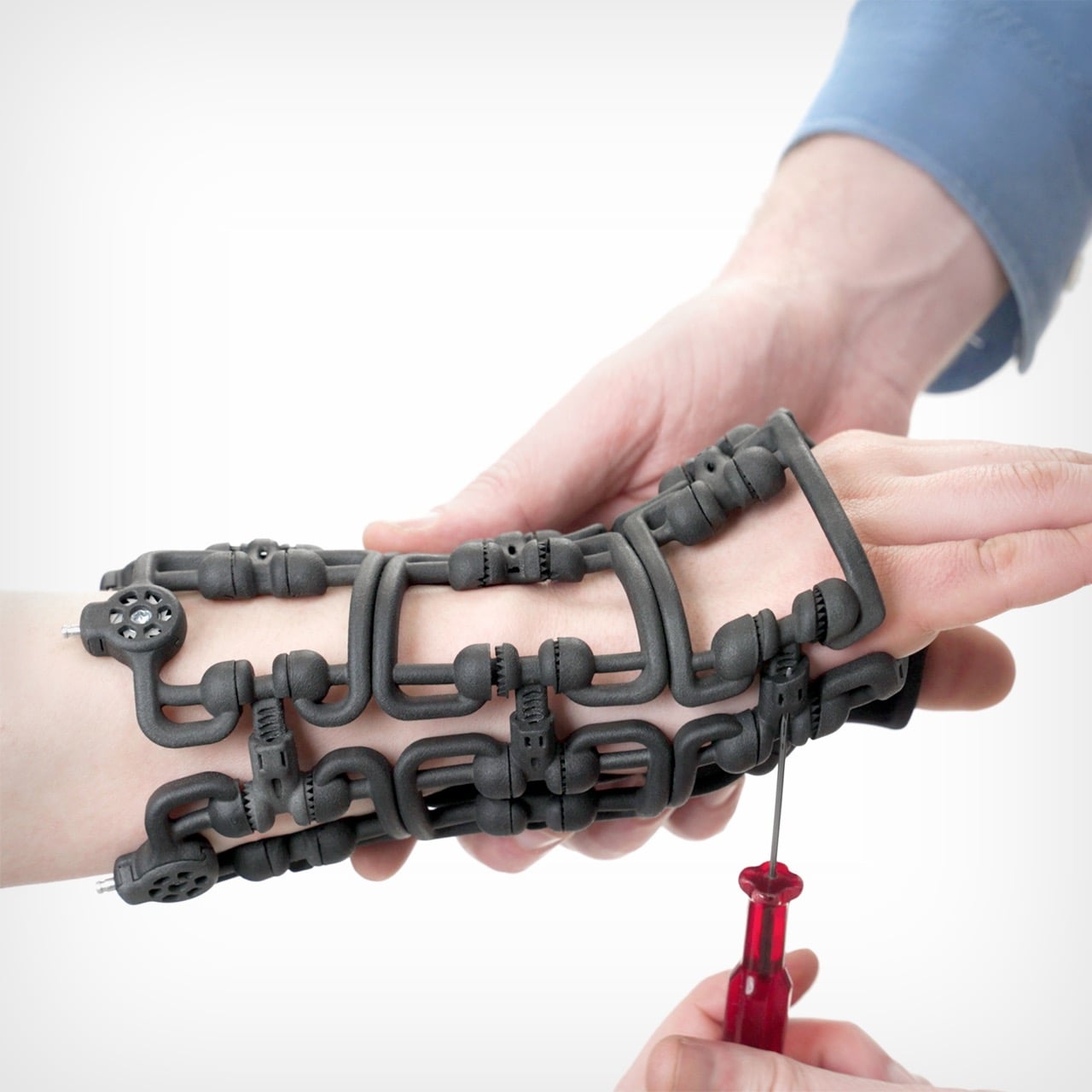 Une attelle typique pour une fracture de Colles mesure 190 x 90 x 115 mm une fois assemblée, mais peut se réduire à plat dans une enveloppe A4. Les cliniciens l’enroulent autour du membre de manière lâche, permettant aux unités segmentées de trouver leur alignement anatomique naturel, puis utilisent des outils de la taille d’un tournevis pour ajuster la longueur des connecteurs et serrer progressivement les cadrans de tension. Des goupilles à dégagement rapide à ressort facilitent les ajustements en fonction de l’enflure durant la récupération. La première mise en place prend quelques minutes. Ce temps d’installation est un avantage évident par rapport aux orthèses personnalisées en 3D qui nécessitent des semaines, et aux attelles de drugstore qui ne s’ajustent à personne.