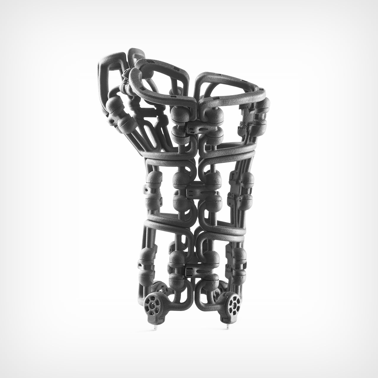 Des câbles en Kevlar traversent le cadre et sont tendus via des cadrans intégrés, s’inspirant directement des systèmes de gréement de bateau où des points de tension distribués créent un contrôle précis. Le gréement de yacht parvient à supporter des charges structurelles énormes en faisant appel à ce même principe. Osteoid a appliqué cela à l’immobilisation du poignet. Le cadre est réalisé grâce à des impressions 3D en SLS et MJF utilisant un nylon médical de qualité, renforcé aux points de contrainte avec de l’aluminium usiné CNC et de l’acier inoxydable. Cette approche hybride de fabrication permet d’obtenir une complexité géométrique adaptée à l’anatomie tout en maintenant l’intégrité structurelle là où les forces se concentrent. Ni le moulage par injection pur ni l’impression 3D pure ne pourraient atteindre de telles formes organiques.