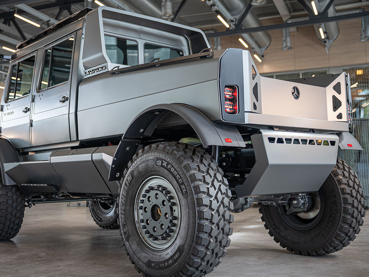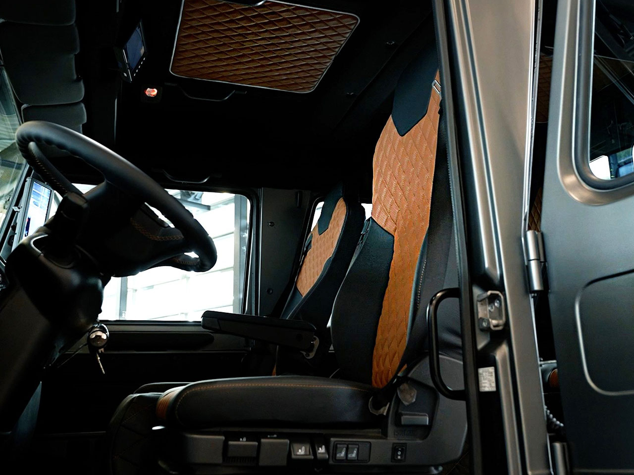 L’intérieur du Unimog est un mélange de luxe et de praticité, avec des sièges en cuir premium, un éclairage d’ambiance LED, et un aménagement ergonomique. Il peut accueillir quatre passagers et vise à offrir un confort exceptionnel lors de longs trajets.