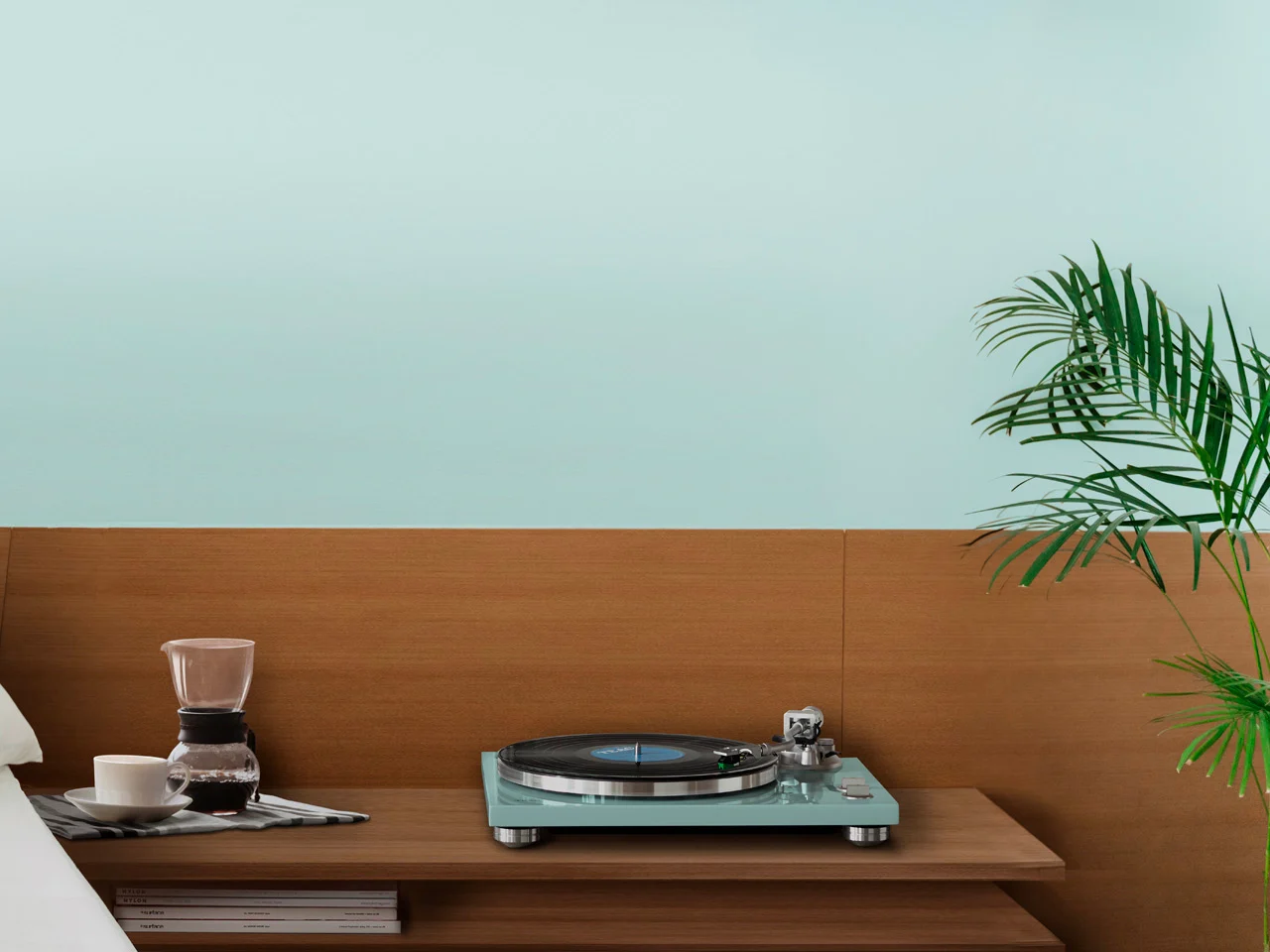 Dans un intérieur lumineux, ce tourne-disque se distingue sous un couvercle transparent, offrant un beau spectacle pendant la lecture d’un vinyle. Le piètement turquoise le démarque des appareils impersonnels, évoquant plutôt un accent de style des années 50 que du matériel audio banal. En dépit de son apparence joyeuse, ce tourne-disque reste un équipement audio sérieux, qui ne recule pas devant la couleur.