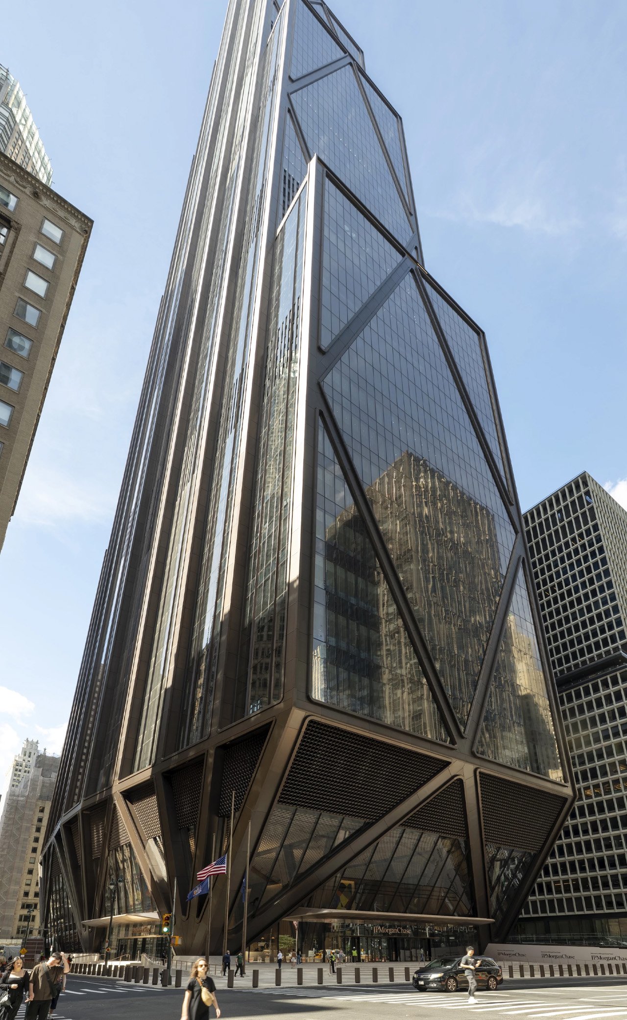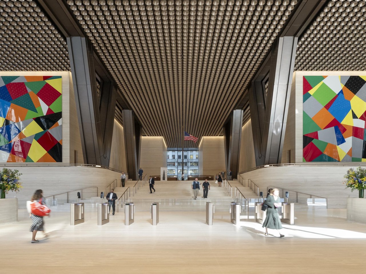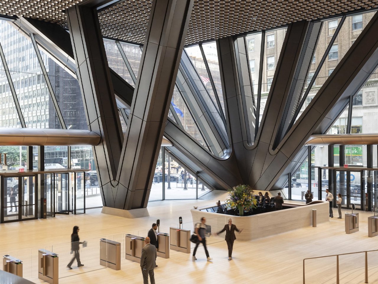 À première vue, la tour de 270 Park Avenue se distingue par son silhouette dramatique et sa couronne en diagrille en bronze. Les architectes de *Foster + Partners* ont conçu le bâtiment pour qu’il soit à la fois visuellement frappant et structurellement audacieux : la masse principale est élevée de près de 80 pieds au-dessus du niveau de la rue, soutenue par d’énormes colonnes en forme d’éventail, conférant à la base une légèreté et une ouverture. Cela non seulement crée une grande entrée accueillante, mais élargit également l’espace public.