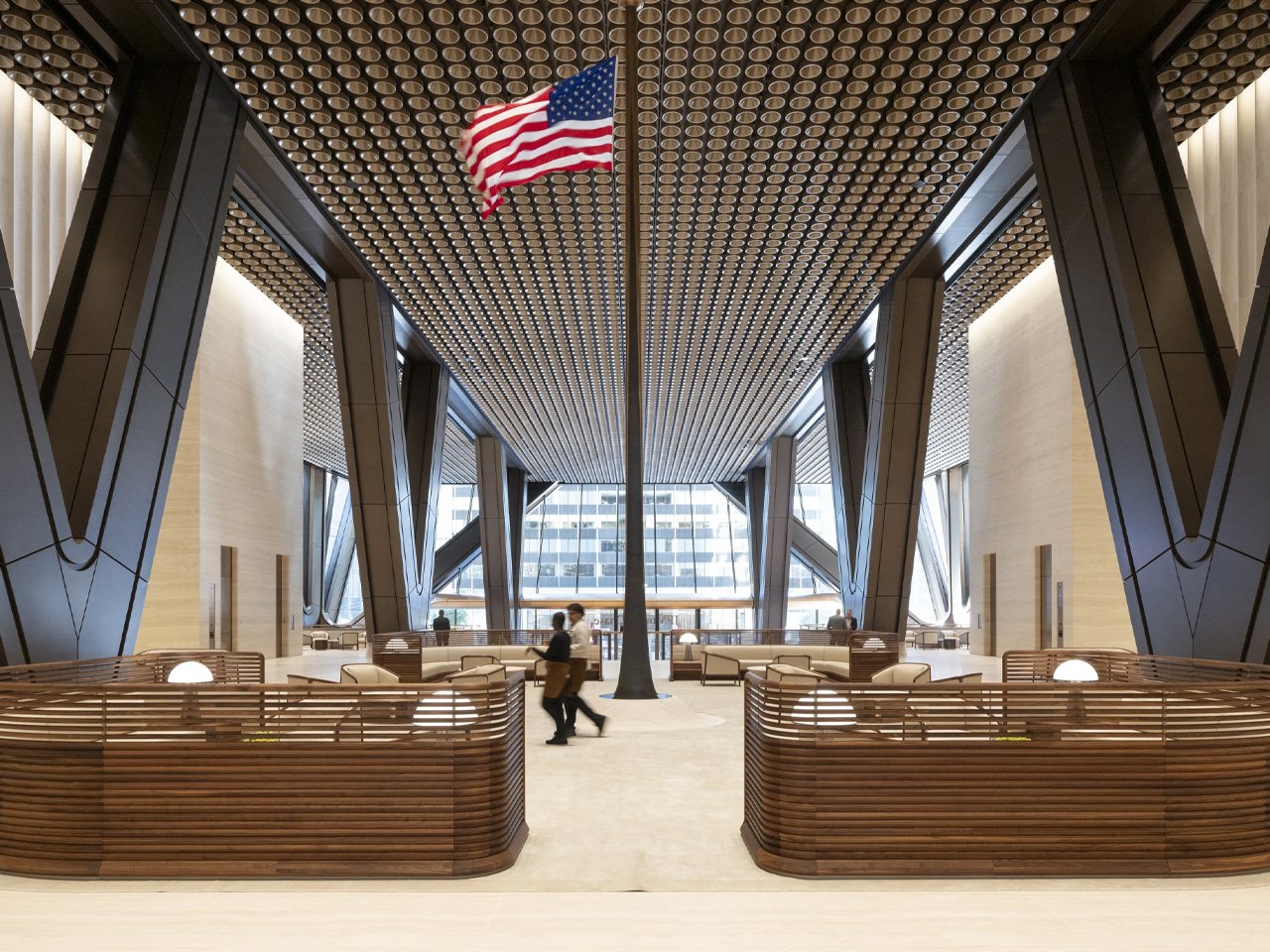 À l’intérieur, le bâtiment est conçu pour être adaptable. De grands plateaux ouverts et un noyau d’ascenseurs partagé maximisent la perméabilité et la flexibilité, tandis qu’une utilisation extensive de la verre inonde l’intérieur de lumière naturelle. *Gensler*, responsable de plus de 1,7 million de pieds carrés d’espace intérieur, a créé des environnements axés sur le bien-être humain, intégrant des commodités telles que des salles de sport, des centres pour clients et des terrasses communes. L’éclairage circadien, les systèmes de filtration d’air avancés et les jardins en terrasse soutiennent davantage la santé et la productivité des employés.
