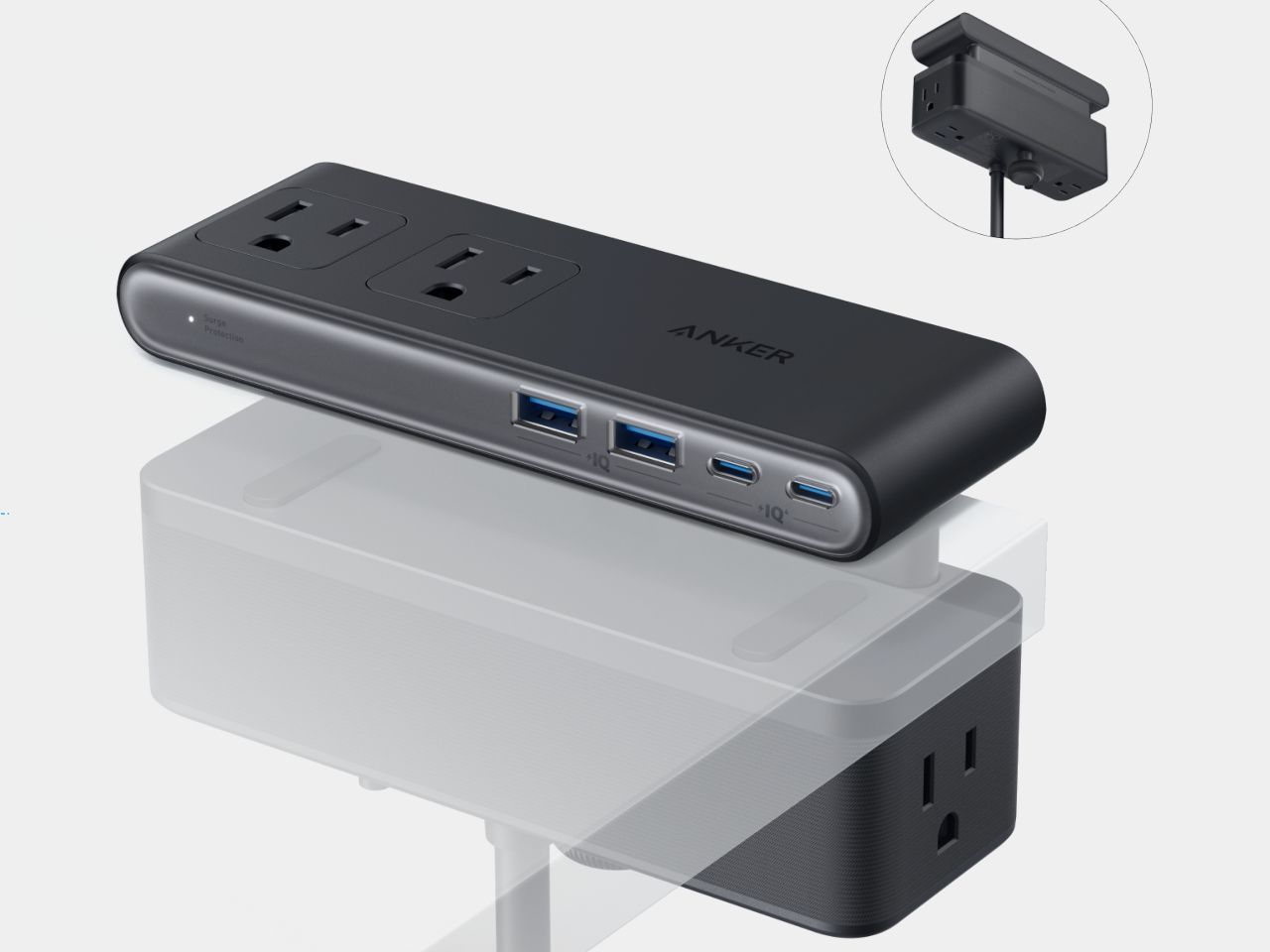 La multiprise Anker Nano Power Strip combine six prises CA avec deux ports USB-C et deux ports USB-A, tout en incluant une protection contre les surtensions. Son design en pince permet de la fixer facilement à un bureau pour un accès pratique.