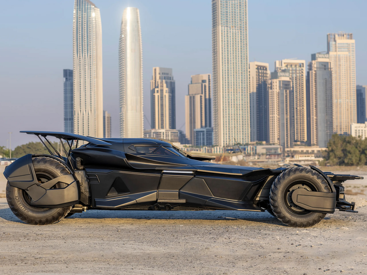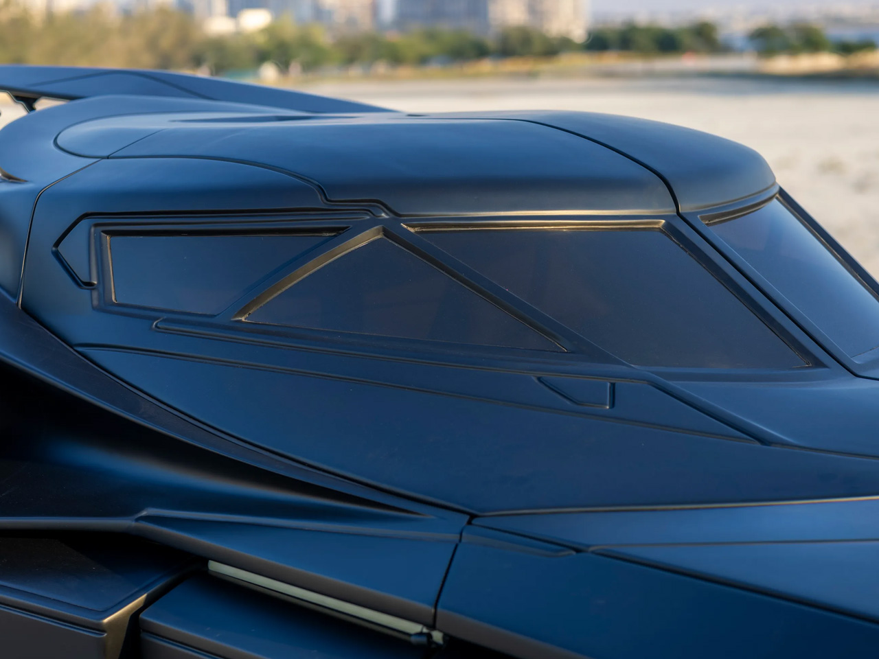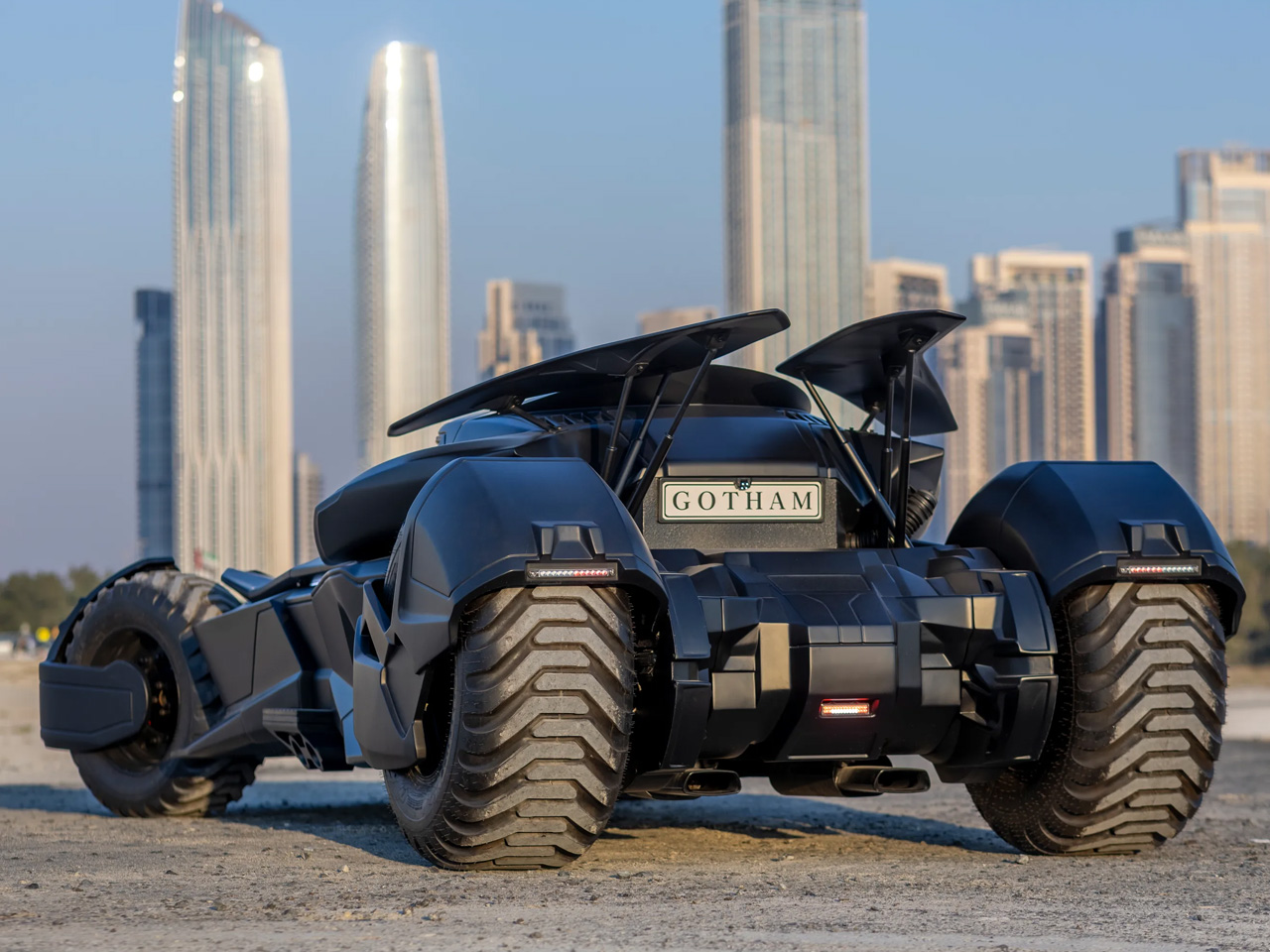 La Batmobile Tribute se distingue par une multitude de détails. On y trouve des ailettes de roue flottantes, des tourelles de mitrailleuse simulées, des portes basculantes avec pare-brise intégré, des spoilers arrière doubles, et une plaque arrière portant fièrement l’inscription "GOTHAM".