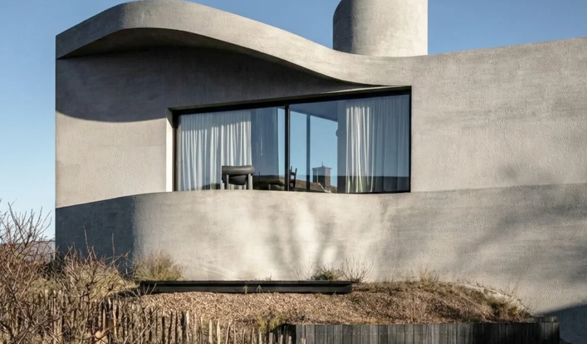 La structure en béton de la villa présente des courbes qui ne sont pas simplement superficielles. Ces courbes guident chaque détail, de l’ouverture du garage à l’intégration de la maison dans le sol. Les chambres, partiellement enfouies dans les dunes, traduisent à la fois une nécessité fonctionnelle et une intention conceptuelle. La maison semble non pas se poser sur le paysage, mais s’y ancrer profondément.
