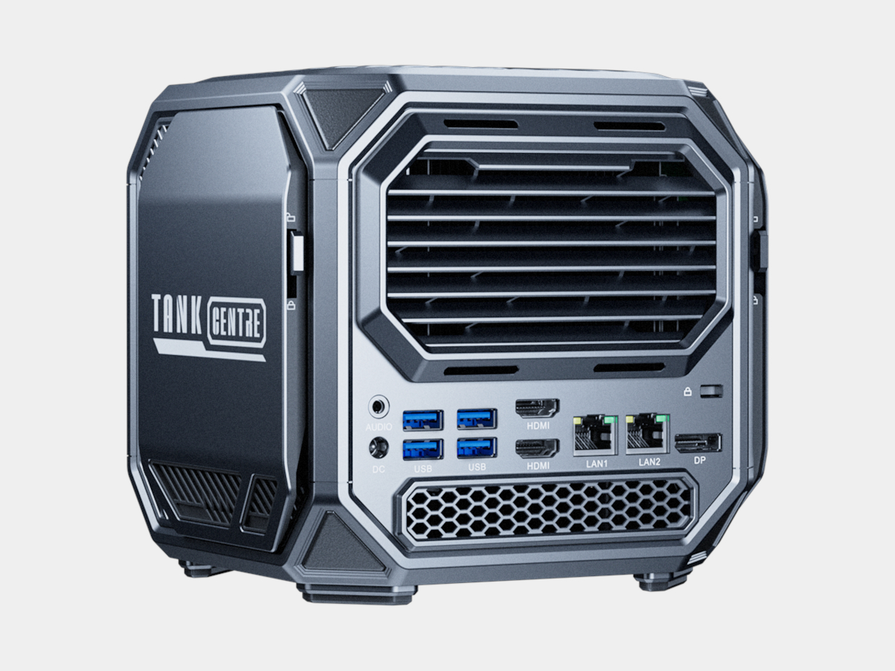Les panneaux latéraux arborent la marque "Tank Centre" avec une finition métallique sombre qui passe d’un gris ardoise à un métal poli, créant ainsi des jeux de lumière uniques. Bien que ces surfaces restent épurées, la géométrie et le branding affichent clairement qu’il s’agit d’une machine de performance. Chaque angle révèle une intention, un aspect crucial lorsque l’appareil est exposé plutôt que caché sous un bureau.