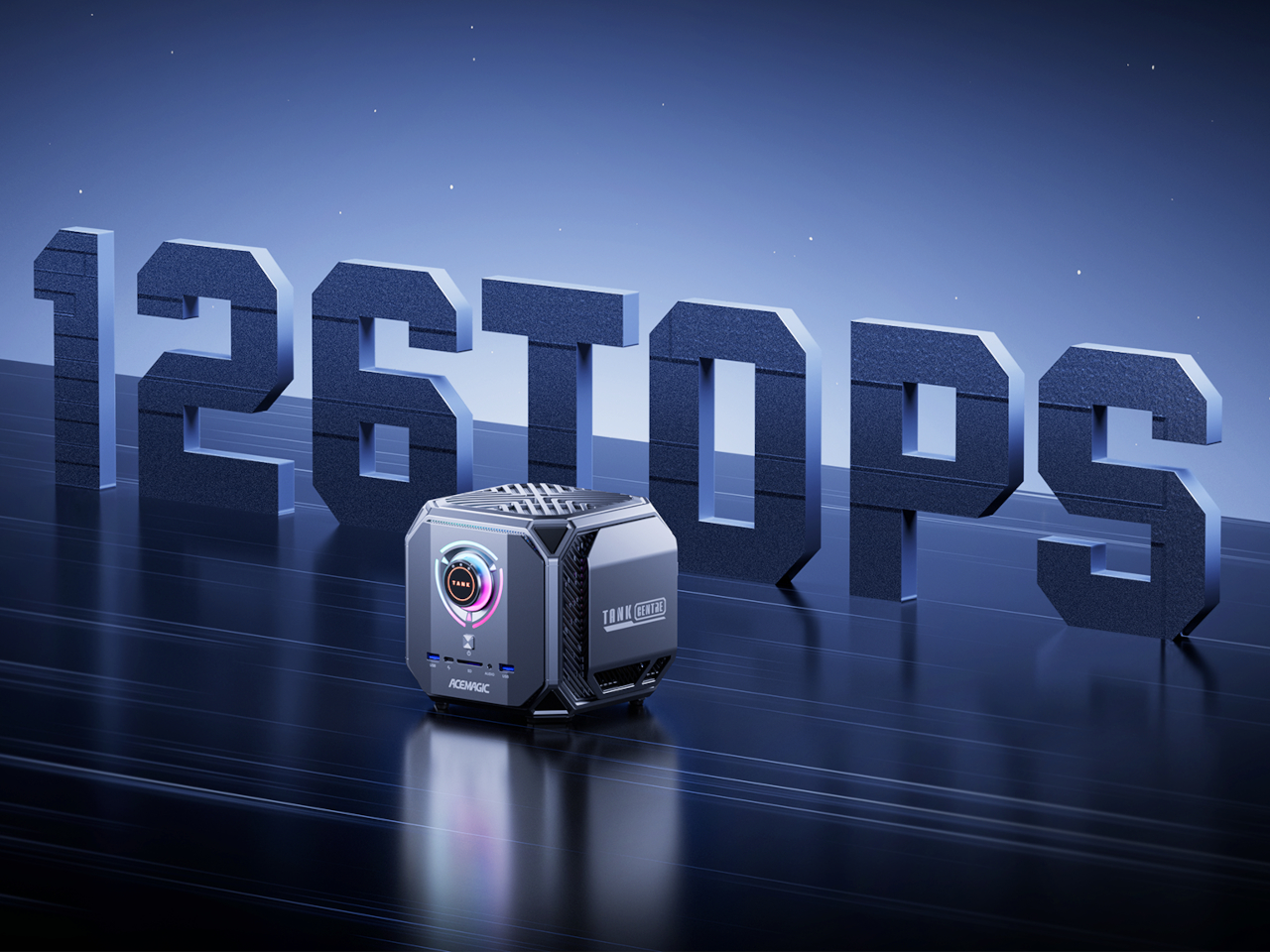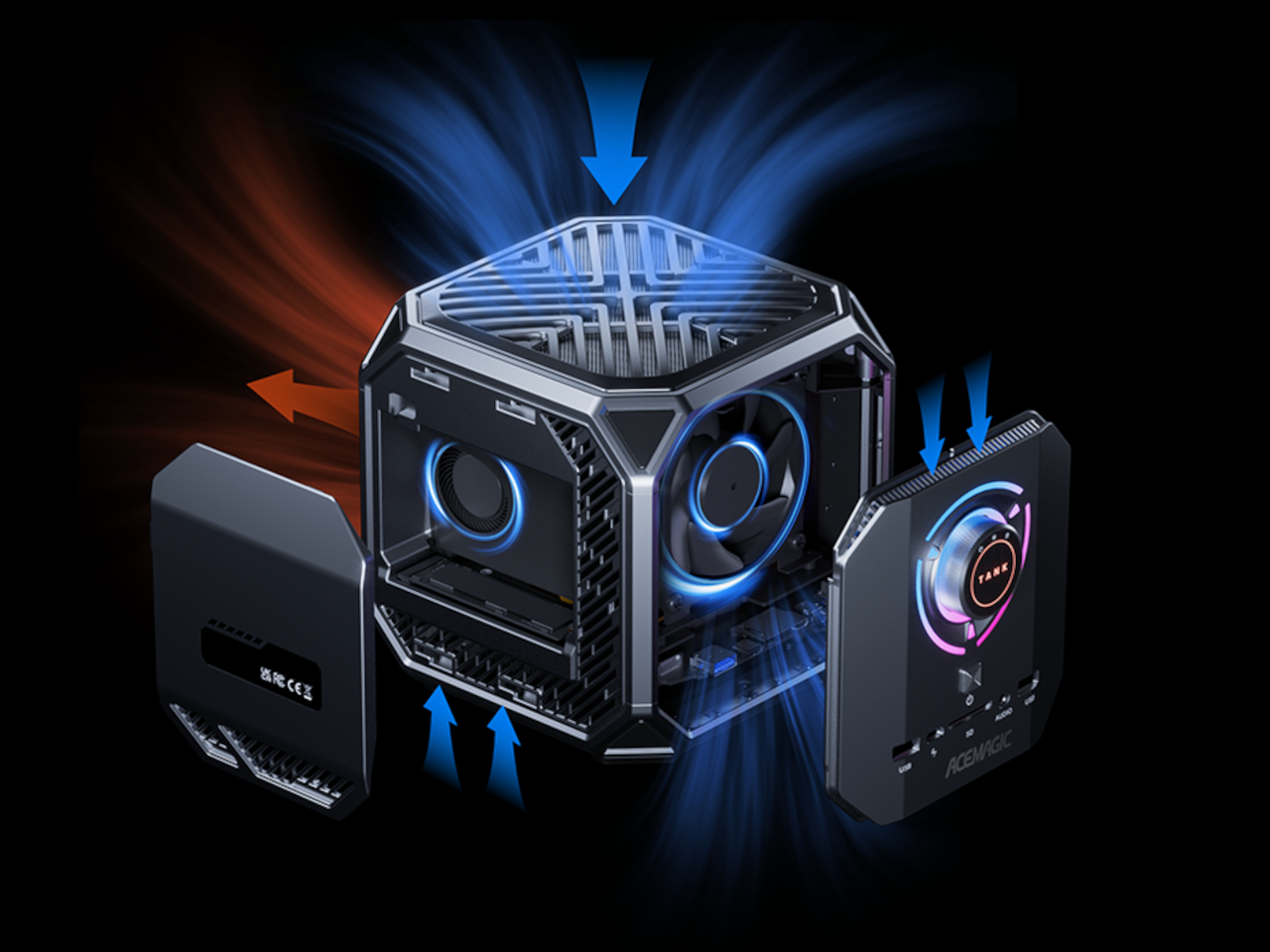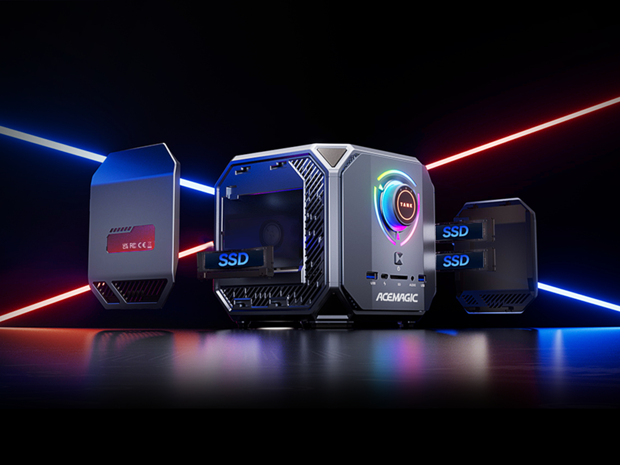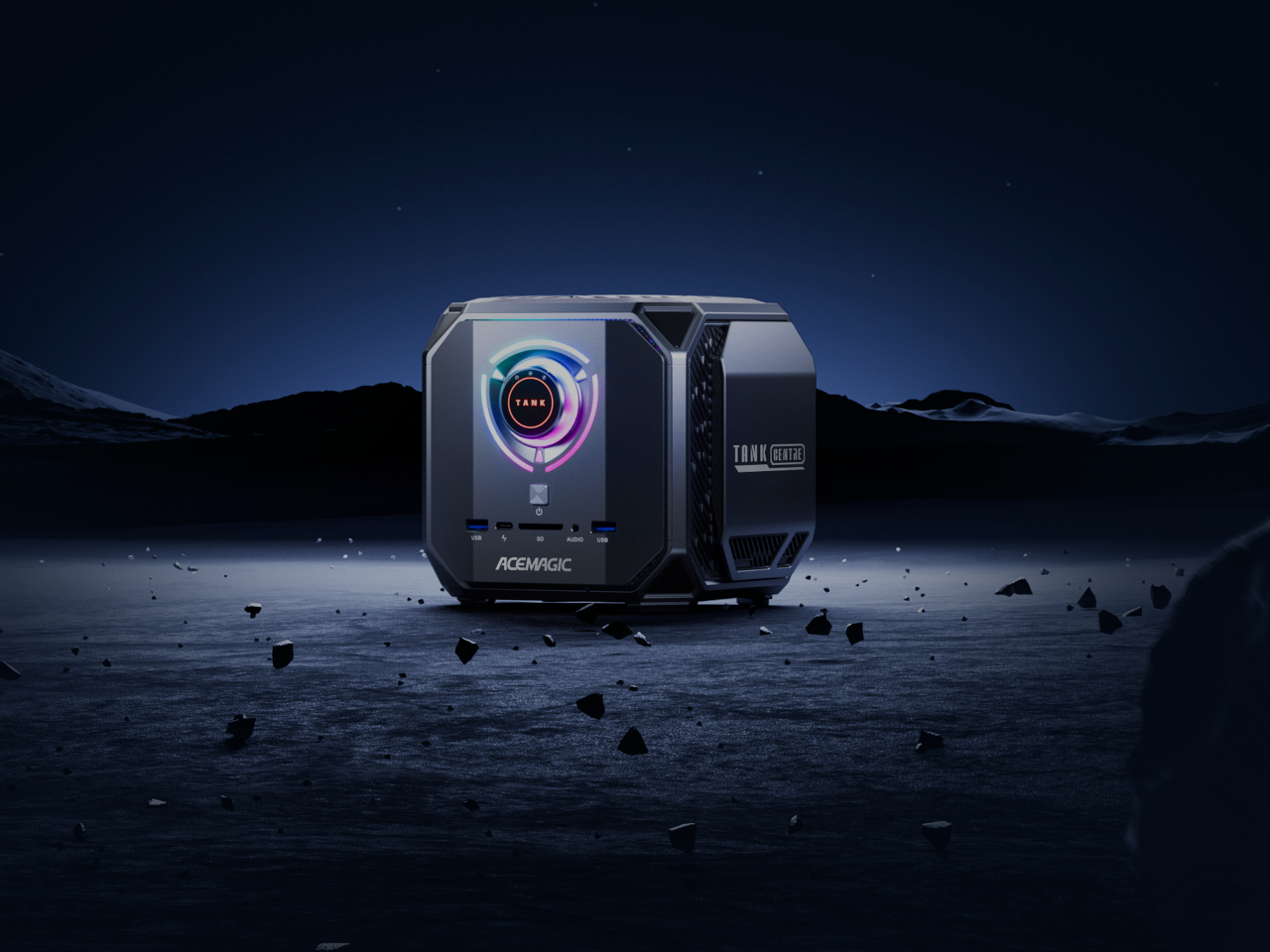 À l’avant, on trouve un grand bouton circulaire portant l’étiquette "TANK", entouré de cercles RGB concentriques qui illuminent son environnement. Ce détail fonctionne comme un élément visuel et sélecteur de modes, évoquant une interface semblable à celle des équipements professionnels. La lumière RGB est à la fois contenue et graphique, créant une atmosphère instrumentale plutôt qu’un spectacle lumineux, même lorsqu’il est en mode performance. Sous ce bouton, le mot ACEMAGIC et une rangée de ports USB à l’avant ancrent l’ensemble.