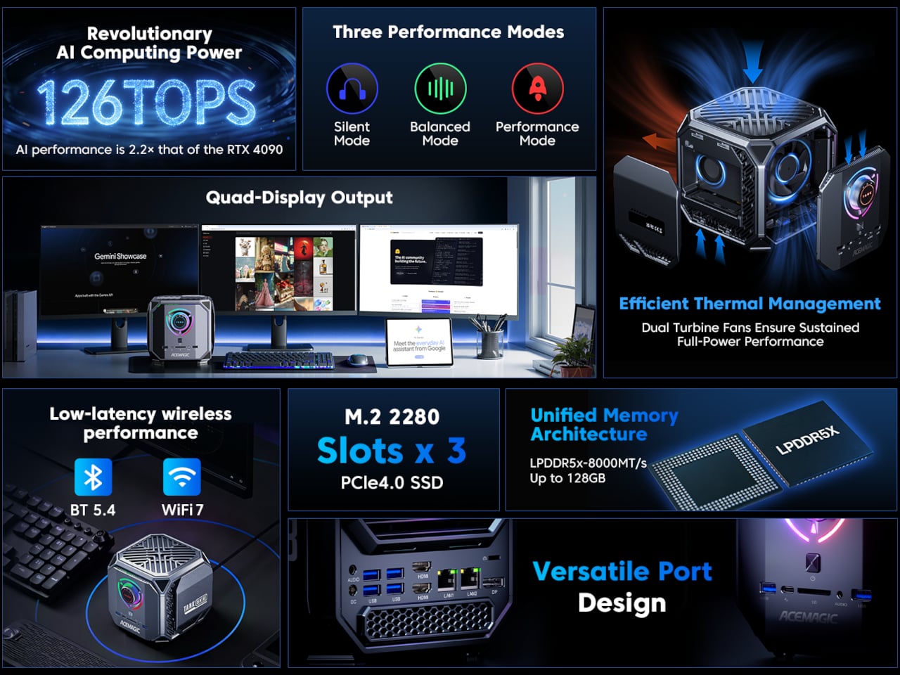 L’ACEMAGIC M1A PRO+ est un mini PC de forme cubique, conçu autour du processeur AMD Ryzen AI MAX 395. Son design unique fait de lui un objet sculpté et visible, plutôt qu’un simple outil de bureau caché.