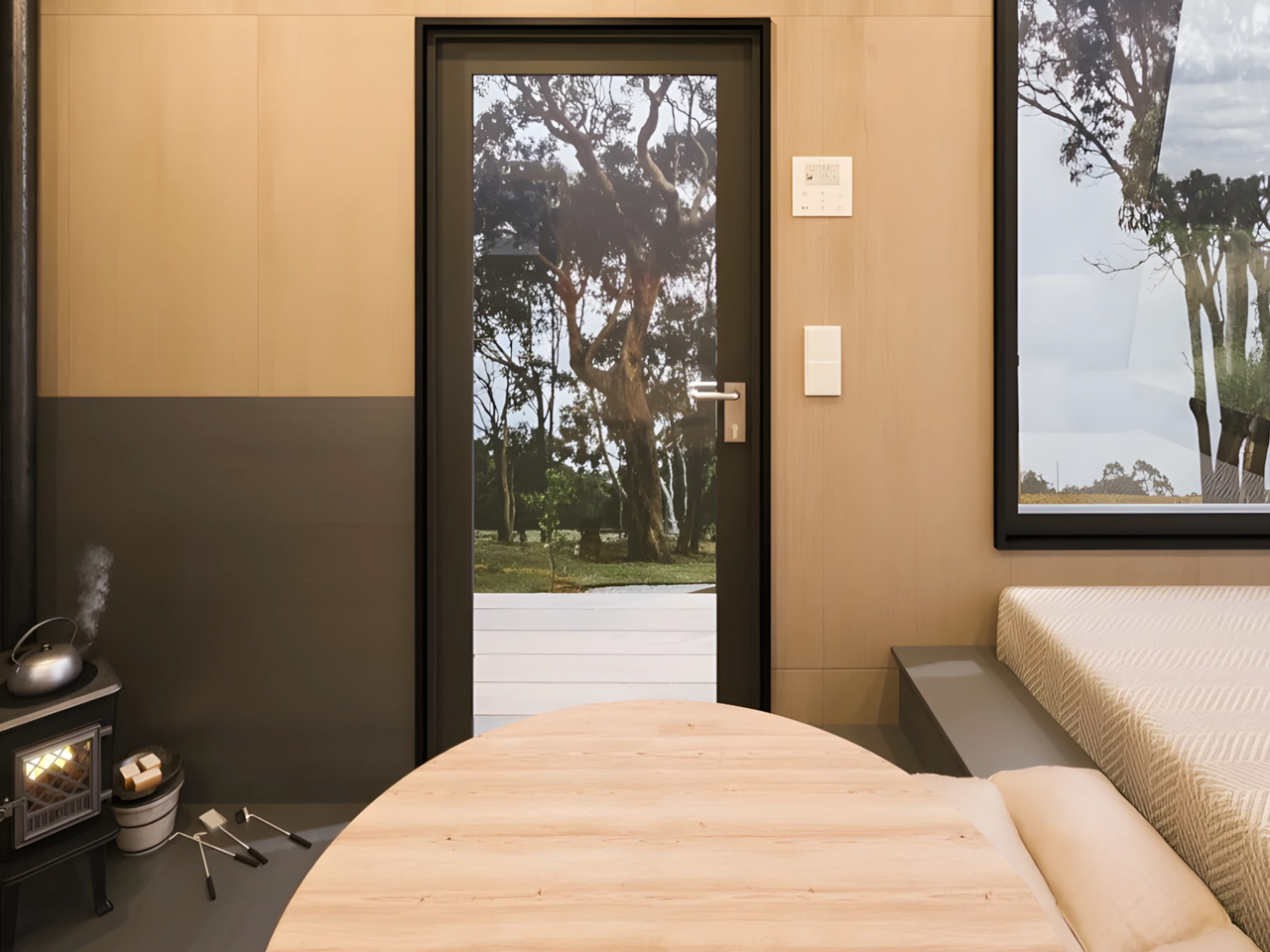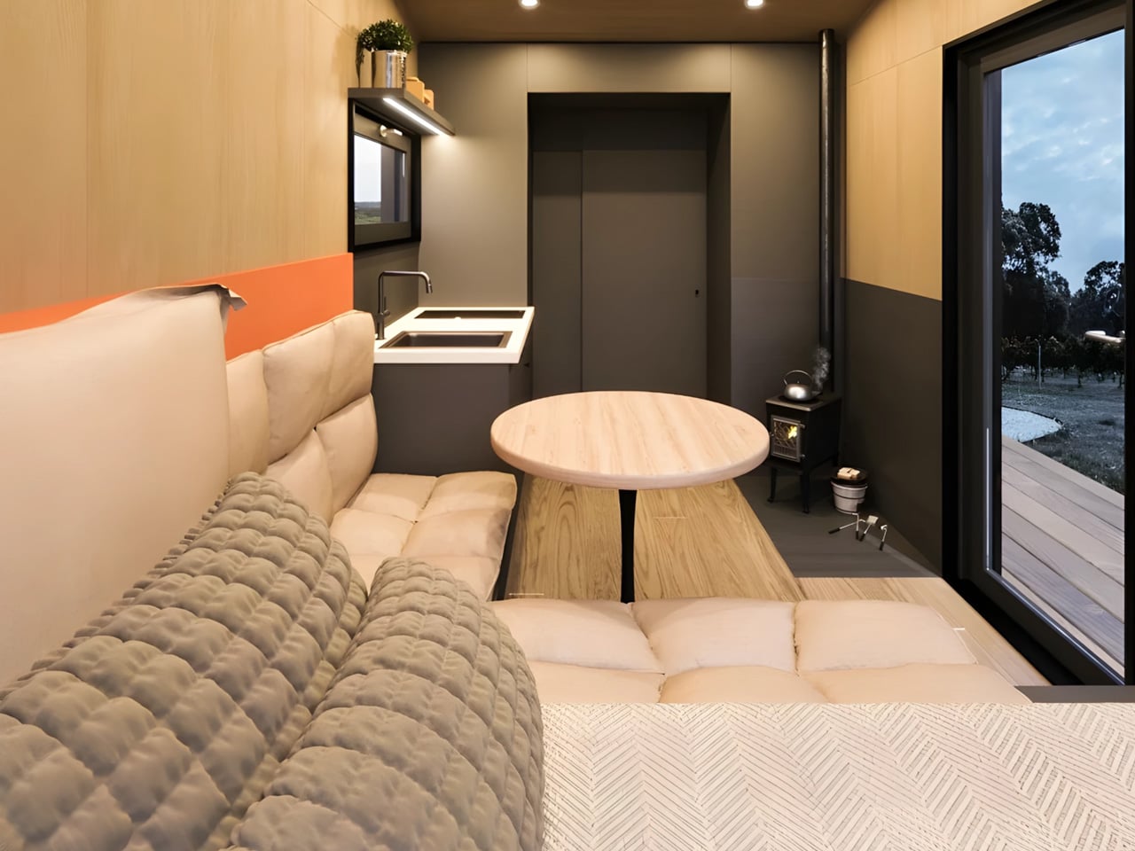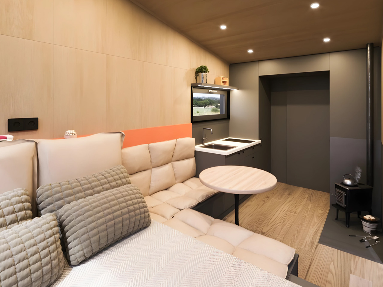 En entrant, on découvre un agencement intelligent où chaque centimètre carré a son utilité sans donner une impression d’encombrement. L’espace s’écoule harmonieusement de la cuisine vers le salon, où un lit double occupe le centre de la pièce. Une petite zone de repos et une table à manger fournissent des espaces dédiés à la détente et aux repas, garantissant que les résidents aient des points de rassemblement pour différentes activités. La salle de bain est séparée, préservant l’intimité au sein d’un plan ouvert. Un poêle à bois ajoute chaleur et confort, élevant l’habitat au-delà d’un simple abri.