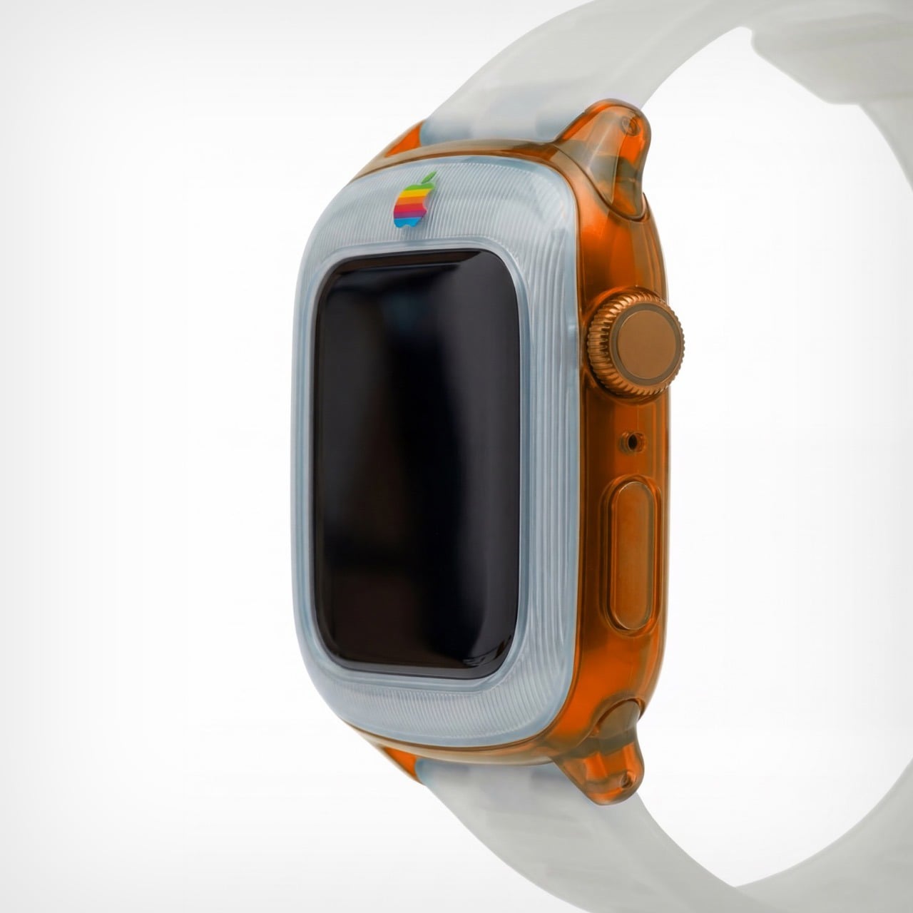 Un élément remarquable de cette conception est la réintroduction du logo coloré d’Apple sur le cadran de la montre. Bien que ce ne soit pas une pratique courante pour les montres, ce choix audacieux rappelle les débuts vibrants d’Apple. Le logo est placé juste au-dessus de l’écran tactile, qui imite le design du CRT de l’iMac G3, d’une manière presque poétique.