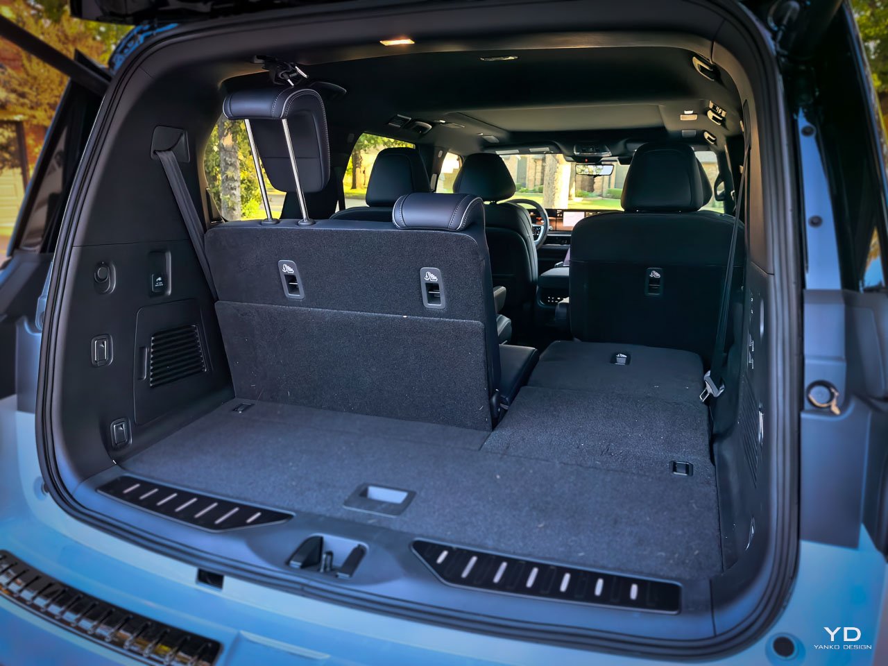La troisième rangée peut accueillir des adultes sans problème. Mesurant 1,88 m, j’y suis resté confortablement pendant 30 minutes. L’espace pour la tête est suffisant, et l’espace pour les jambes fonctionne tant que la deuxième rangée n’est pas repoussée au maximum. L’accès est plus simple que dans la plupart des SUV à trois rangées, grâce à des sièges de deuxième rangée pliables électriquement qui créent un large chemin d’entrée.