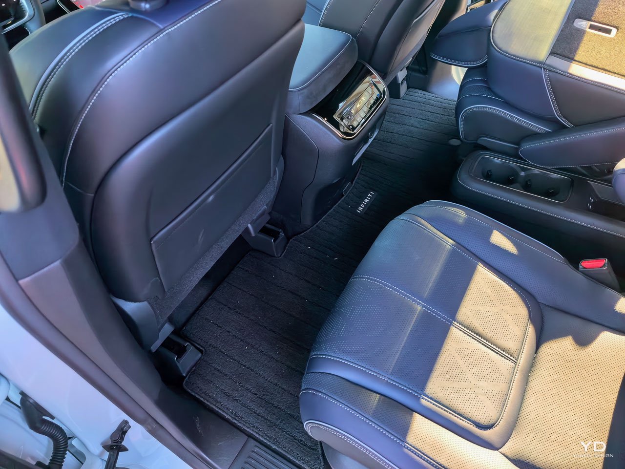 Le QX80 est un SUV de grande taille avec trois rangées et une capacité pouvant accueillir jusqu’à huit passagers. Ces chiffres indiquent la capacité, mais ne transmettent pas la qualité de cet espace. Dans la version Sport que j’ai testée, avec des fauteuils de capitaine disponibles, la capacité est réduite à sept, mais l’expérience se transforme complètement.