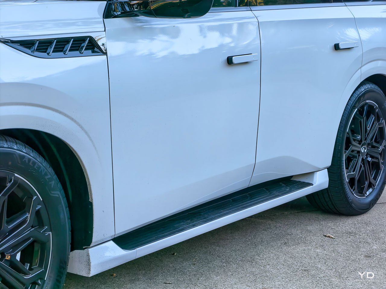 Des accents en aluminium apparaissent tout au long de l’habitacle, notamment sur les grilles des haut-parleurs, les poignées de porte et les entourages de contrôle de la climatisation. Ces éléments reflètent la lumière et fournissent un contraste visuel sans se sentir excessifs. Le package Sport ajoute des touches extérieures uniques telles que des barres de toit noires, un pare-chocs de sport et un badging spécifique qui le différencie des autres niveaux de finition tout en maintenant la présence premium du QX80.