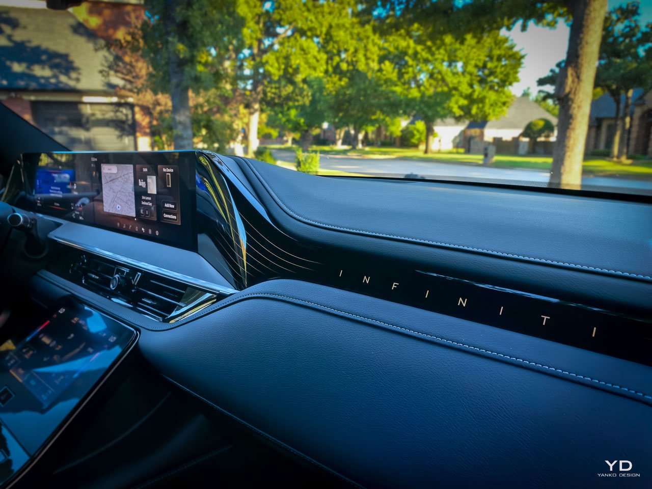 Les surpiqûres contrastées sont précises. Les sièges offrent un bon soutien sans être trop fermes. Le bois s’étend sur le tableau de bord et les panneaux de porte avec un grain visible et tactile. INFINITI ne cache pas le bois sous des couches de vernis ; vous pouvez sentir le caractère naturel du matériau.