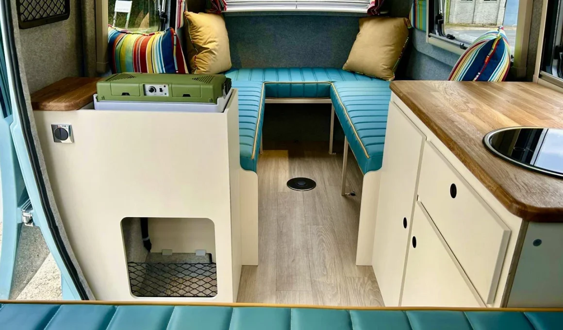 Au centre de la caravane se trouve la cuisine, équipée d’une cuisinière à deux feux et d’un évier, ainsi que de placards de stockage. Un espace dédié pour une glacière est également prévu, tandis que la dinette en forme de U à l’avant reste inchangée. La Bothy peut accueillir jusqu’à trois personnes dans son espace réduit et est construite à partir d’une seule pièce de fibre de verre moulée, ce qui contribue à sa légèreté.