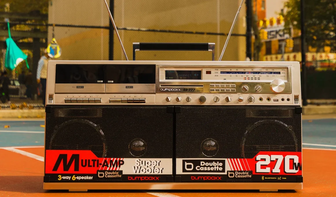 Le Bumpboxx BB-777 redonne vie à l’esthétique des boomboxes des années 80. Avec ses dimensions impressionnantes de 29,6 pouces, il présente un boîtier large et horizontal qui attire immédiatement l’attention. Le BB-777 est l’incarnation d’un style rétro, doté de double compartiments pour cassettes, d’un tuner analogique long, et de quatre haut-parleurs, tous soigneusement intégrés pour capturer l’essence des boombox classiques. Il est également équipé de deux antennes télescopiques et d’une poignée de transport, renforçant l’idée que cet appareil est conçu pour être montré, et non dissimulé.