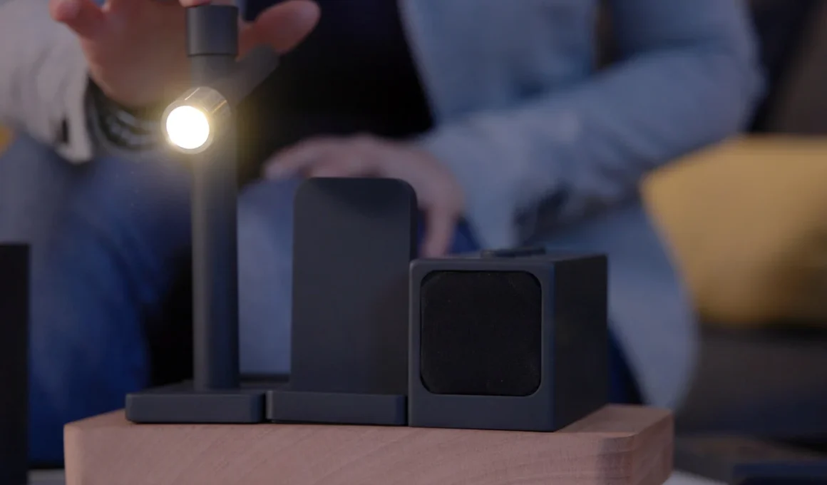 Chaque module se connecte magnétiquement à la base en bois, permettant d’ajouter des dispositifs tels que des chargeurs, des haut-parleurs Bluetooth et des lampes sans avoir à gérer de câbles emmêlés.