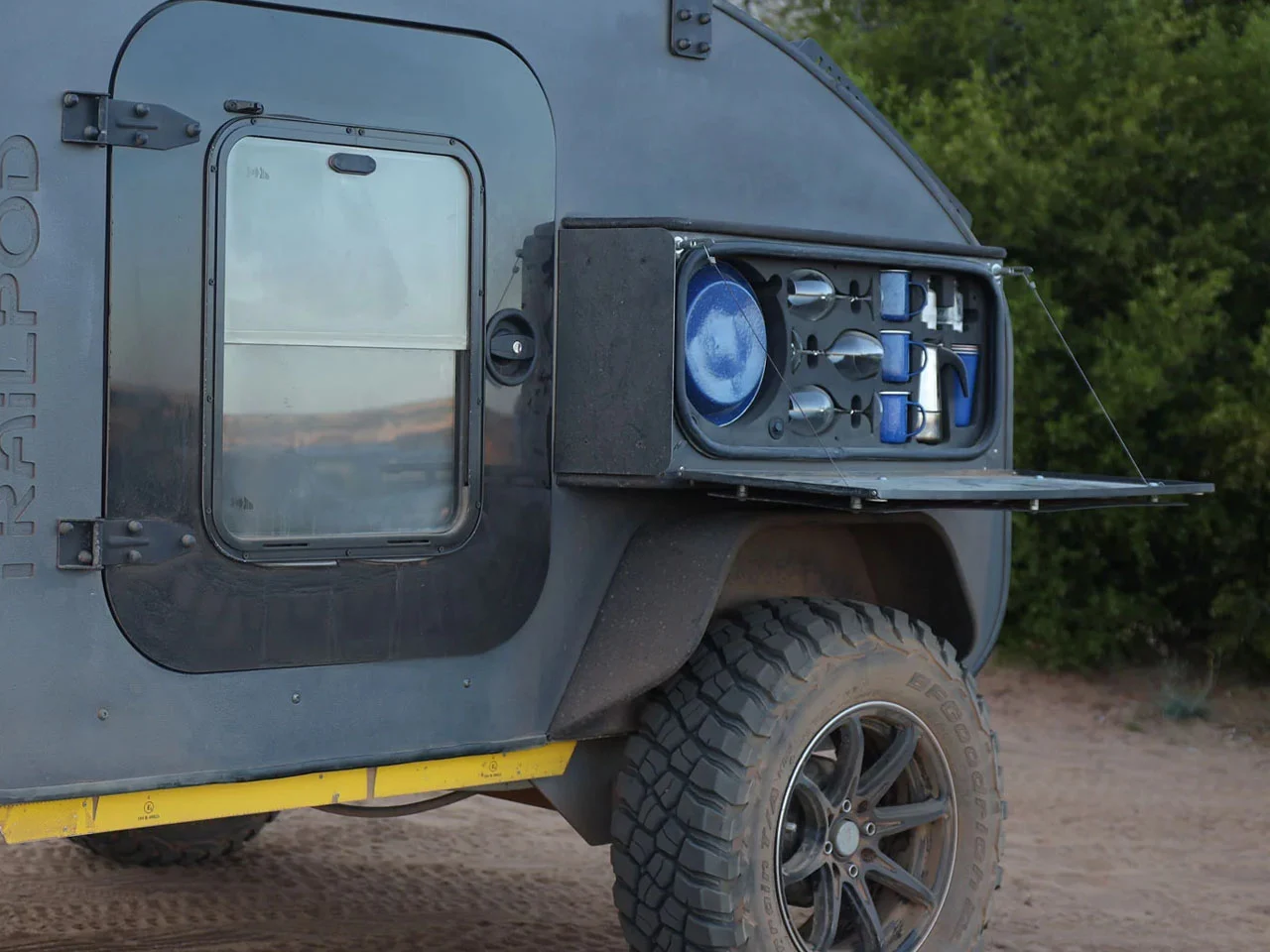 Les remorques TrailPod sont fabriquées en composite sans bois, disposent d’un système de suspension robuste pour le hors-piste et ont un intérieur confortable avec des installations pour deux personnes, y compris une petite cuisine latérale.