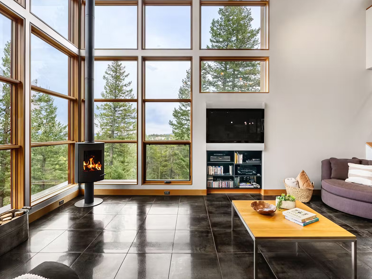 Les espaces de vie exploitent de vastes baies vitrées pour faire entrer l’horizon, joyeusement intégrées dans une palette tranquille et aux lignes épurées. Les sols en noyer apportent une chaleur palpable, tandis que la simplicité des portes en sapin massif inspire une sensation de confort et de qualité. La cheminée, à la présence sculpturale, confère un sentiment de permanence et de sérénité à l’ensemble.