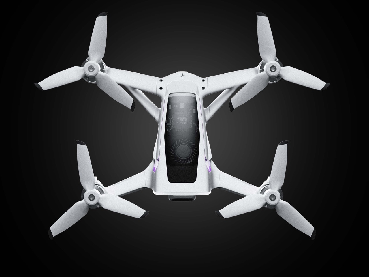 Le corps du drone est en blanc mat, presque céramique, avec des surfaces douces et précises. Il présente également une “fenêtre technologique” en noir qui met en valeur le matériel interne.