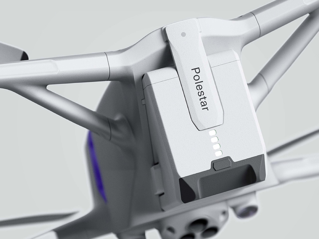 Cependant, cette surface raffinée n’altère en rien l’esprit agressif du drone. Son stance large et ses hélices efficaces indiquent qu’il est construit pour une performance sérieuse. En scrutant la partie inférieure, on découvre un dense réseau de capteurs, conduits de refroidissement et nervures structurelles, attestant qu’il s’agit d’un véritable outil pour les pilotes exigeants, et non d’un simple jouet. Le designer équilibre habilement ces éléments robustes avec une sensibilité conviviale. La batterie en est un parfait exemple : marquée du logo Polestar et dotée d’indicateurs de charge LED intuitifs, elle évoque un produit électronique haut de gamme, rassurant les utilisateurs peu expérimentés.