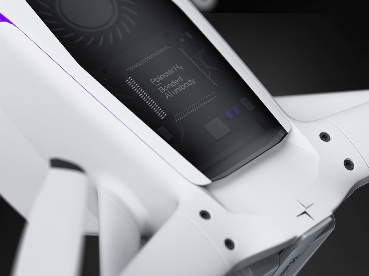 Le corps du drone arbore une finition mate, presque céramique, avec des surfaces douces et extrêmement précises, un aspect signature de la stratégie de surface de Polestar. La longue pièce foncée en haut n’est pas qu’un simple couvercle ; elle agit comme une « fenêtre technologique », encadrant le matériel interne comme un point d’intérêt, à l’image de ce que Polestar réalise avec ses toits en verre et barres de capteurs intégrées. Même l’éclairage est conçu avec une discipline automobile ; les accents violets fins ressemblent à des lames de lumière caractéristiques, fournissant une lueur contrôlée qui évoque une technologie avancée, loin des bandes RGB souvent chaotiques des modèles FPV personnalisés.