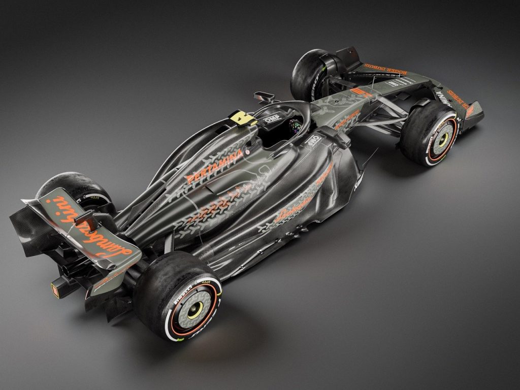 Les détails techniques révèlent la compréhension d’Almkvist des réglementations contemporaines de la F1. La voiture présente les éléments aérodynamiques complexes requis par les règles actuelles, avec des pontons latéraux larges, des bargeboards intriqués et des ailes multi-éléments. La marque des pneus Pirelli inclut un code couleur approprié pour l’identification des composés, avec des marquages sur les flancs orange et jaunes que tout fan de F1 reconnaîtrait.