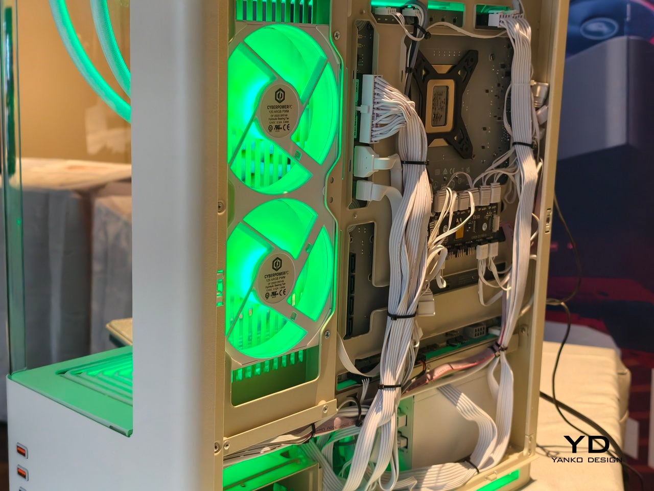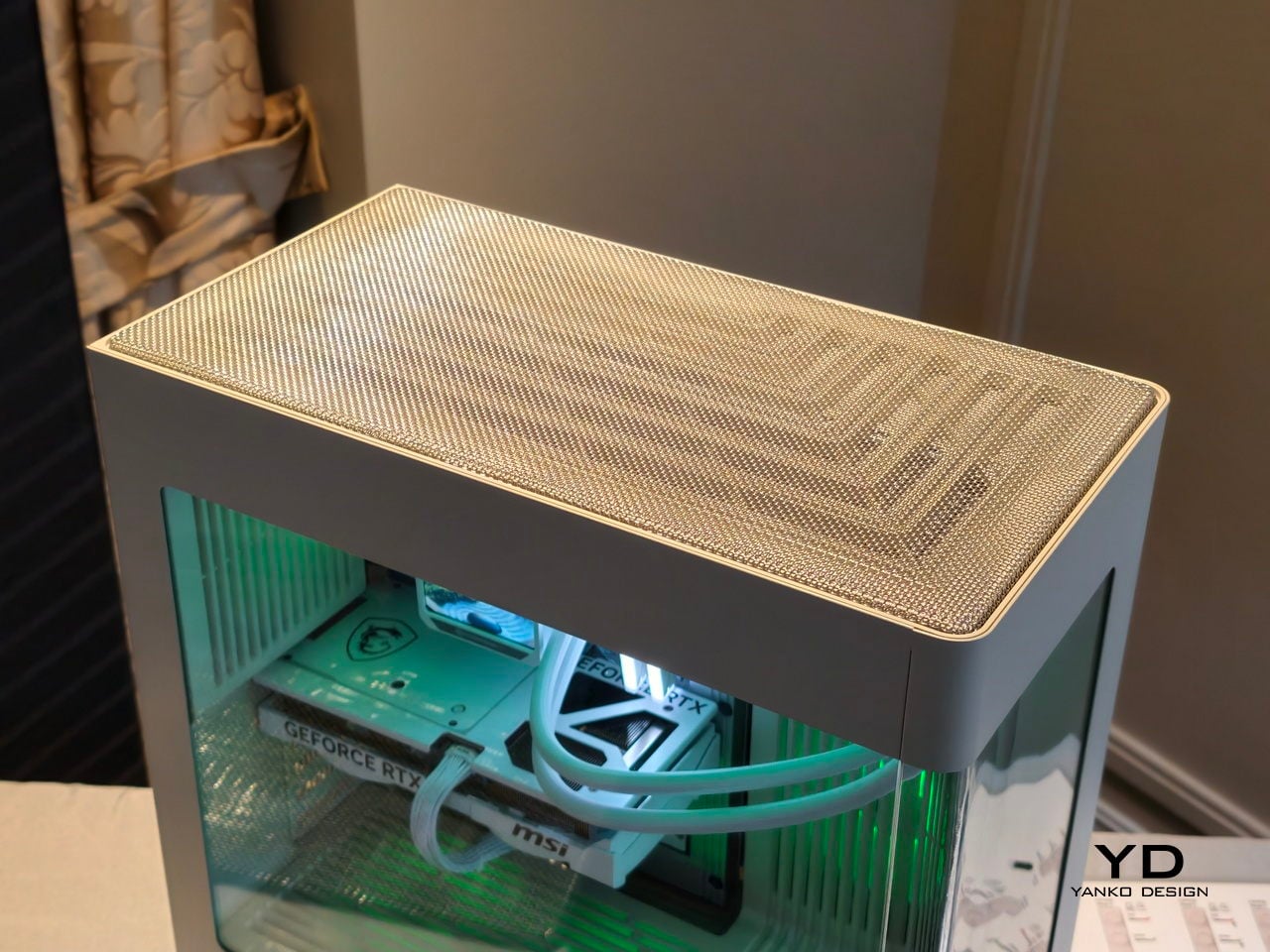 L’architecture interne dissimule les ventilateurs, radiateurs et câblages derrière des couvercles d’admission multifonctions et des housses internes, donnant à l’intérieur une composition épurée plutôt qu’un enchevêtrement de pièces. L’accent est mis sur le GPU, le refroidisseur et la RAM, qui sont presque traités comme des objets sur une scène, avec une géométrie cohérente et des points de montage minimaux visibles. Le châssis ne ressemble pas à un kit en attente d’assemblage, mais bien à une vitrine pour le matériel vraiment important.
