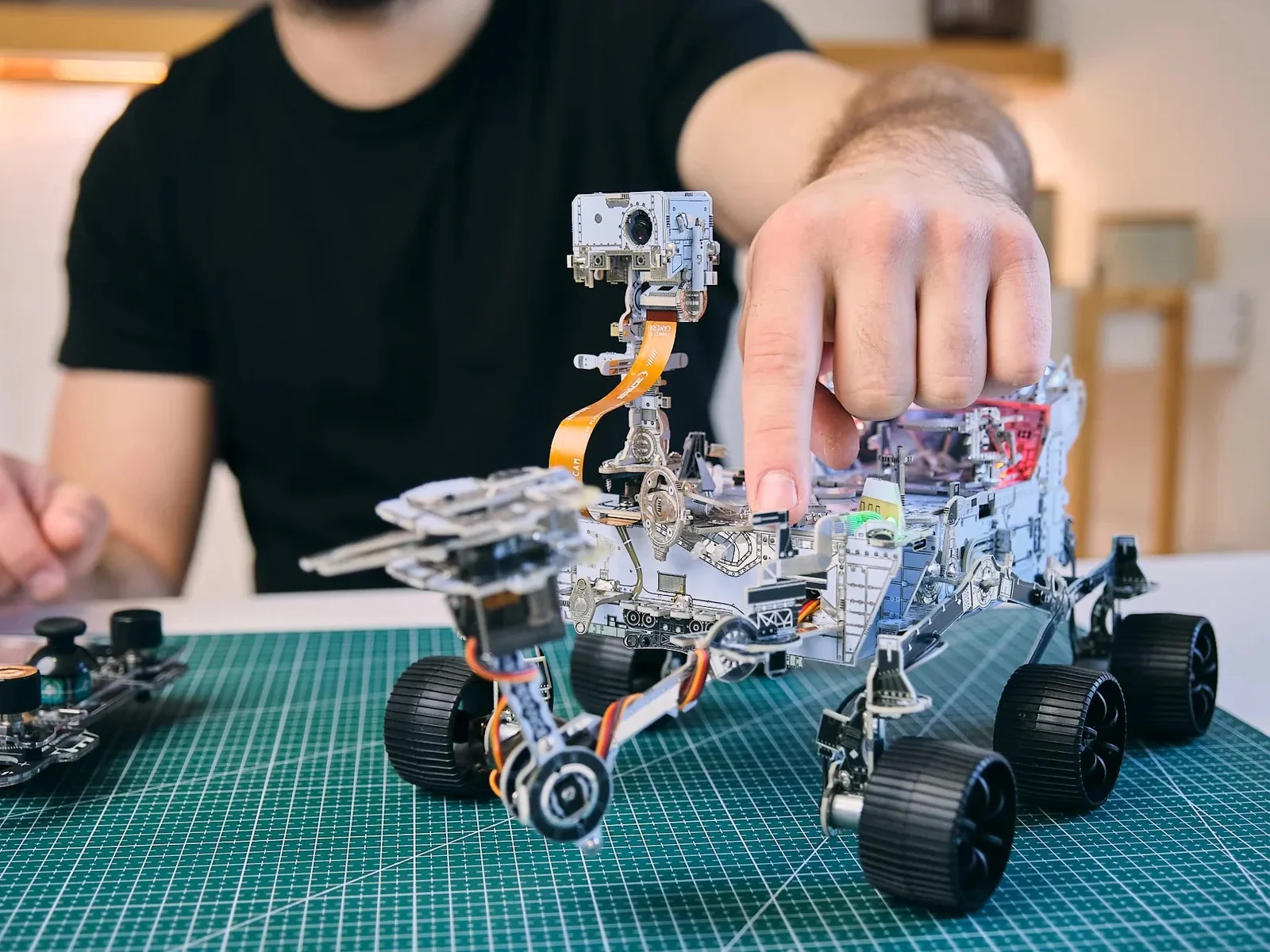 CircuitMess et GeeekClub ont obtenu l’approbation de NASA pour le merchandising et ont conçu la mécanique du kit en respectant la géométrie réelle du rover, y compris la suspension rocker-bogie qui permet un mouvement indépendant des roues sur des terrains irréguliers. Le matériel comprend six moteurs à courant continu pour la propulsion, deux servomoteurs pour le bras et la caméra, un microcontrôleur ESP32 dual-core et un module de caméra capable de reconnaissance d’objets. L’assemblage nécessite de souder plus de 300 composants, ce qui prend environ 20 heures, avec tous les outils fournis dans le kit.