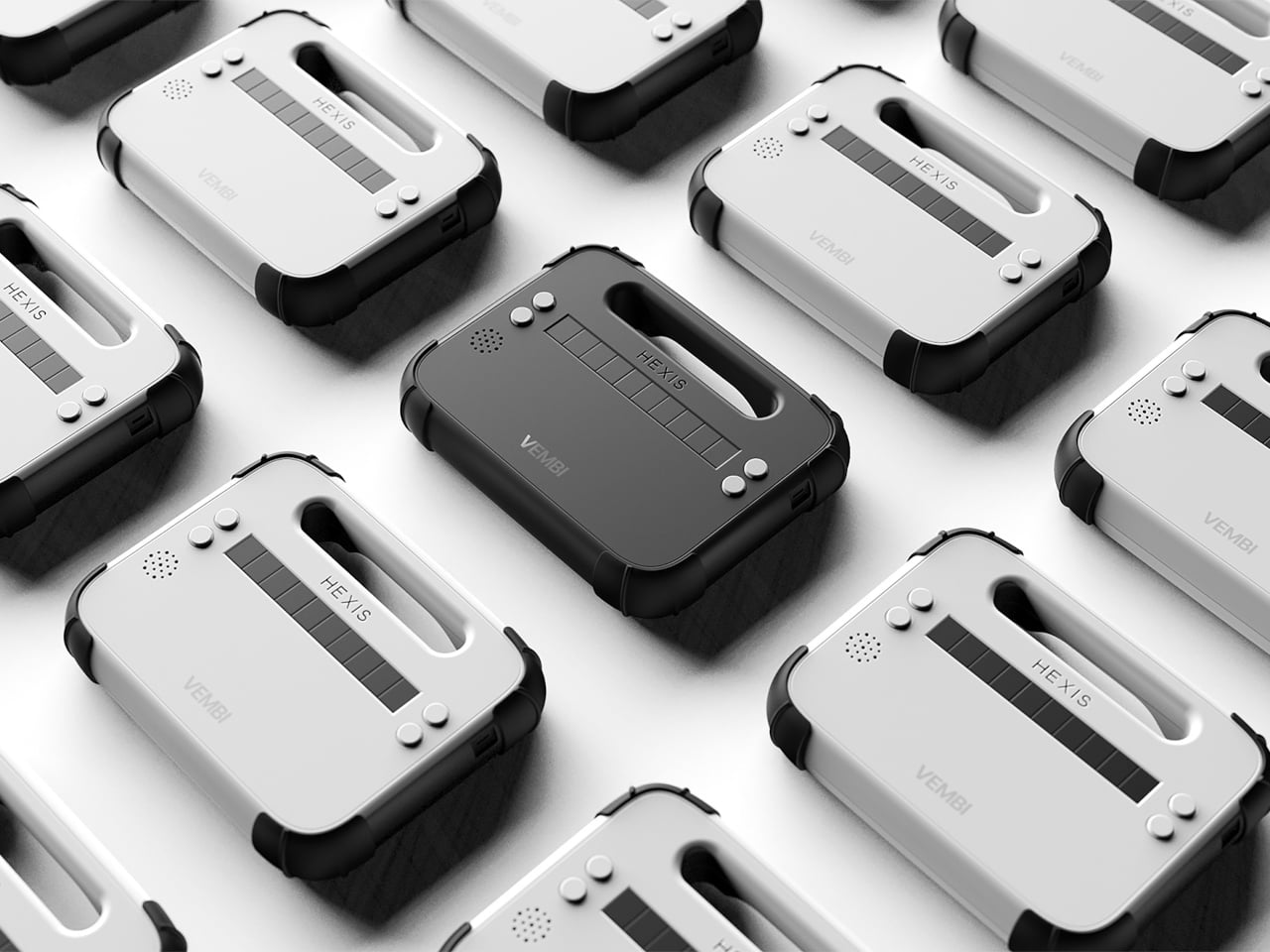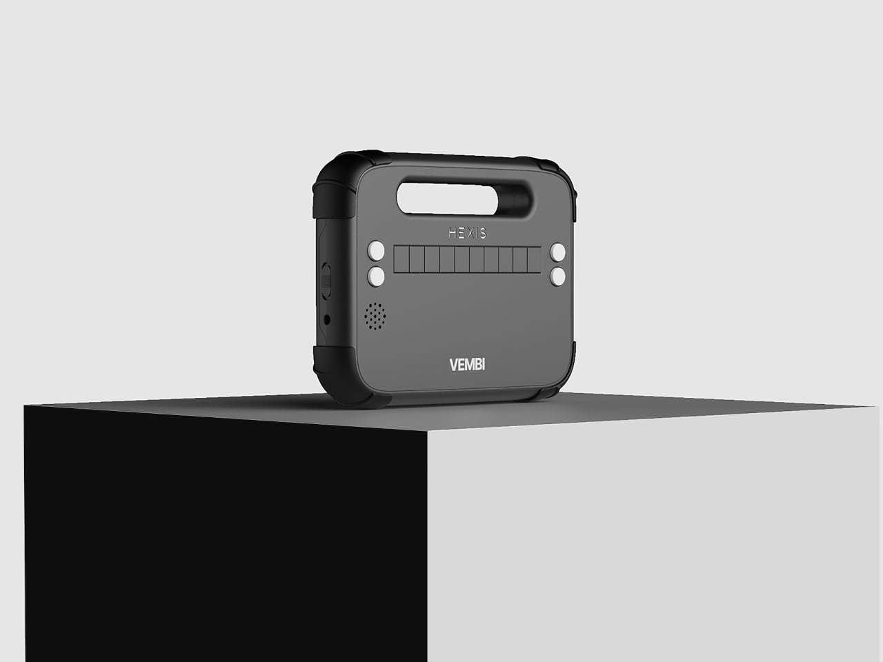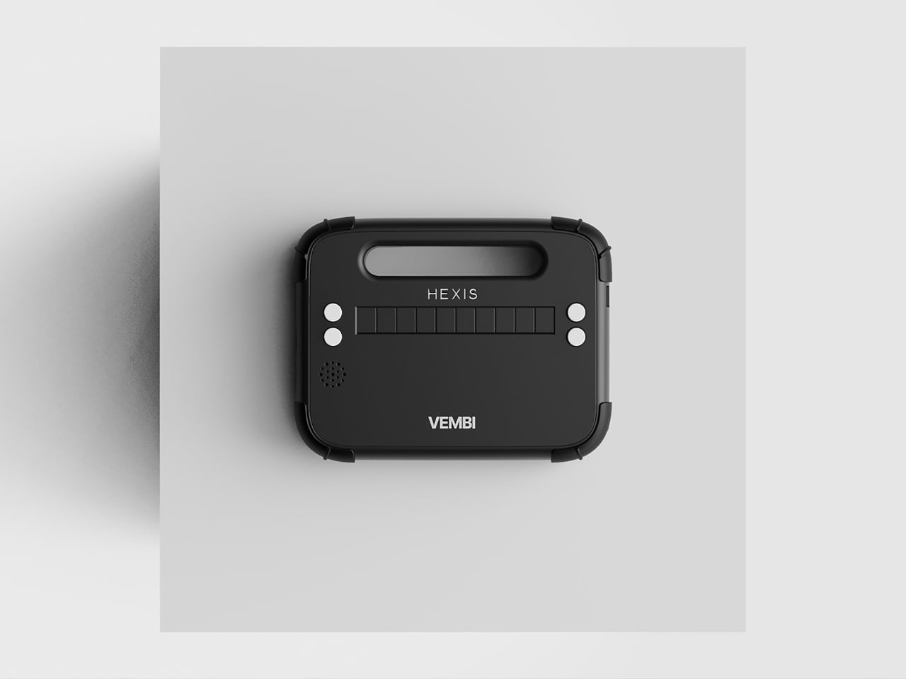 Le lecteur prend la forme d’un rectangle à coins arrondis, avec des bords épais qui donnent une sensation de solidité, comparable à celle d’une tablette robuste plutôt que d’un dispositif médical. La face avant est dominée par une barre d’affichage en braille, avec une grille de haut-parleur discrète et des boutons de contrôle placés de manière à ne pas entraver la manipulation. Le branding est minimal, affichant seulement de petites marques HEXIS et VEMBI, ce qui permet de présenter l’objet comme un outil pour enfants avant tout.